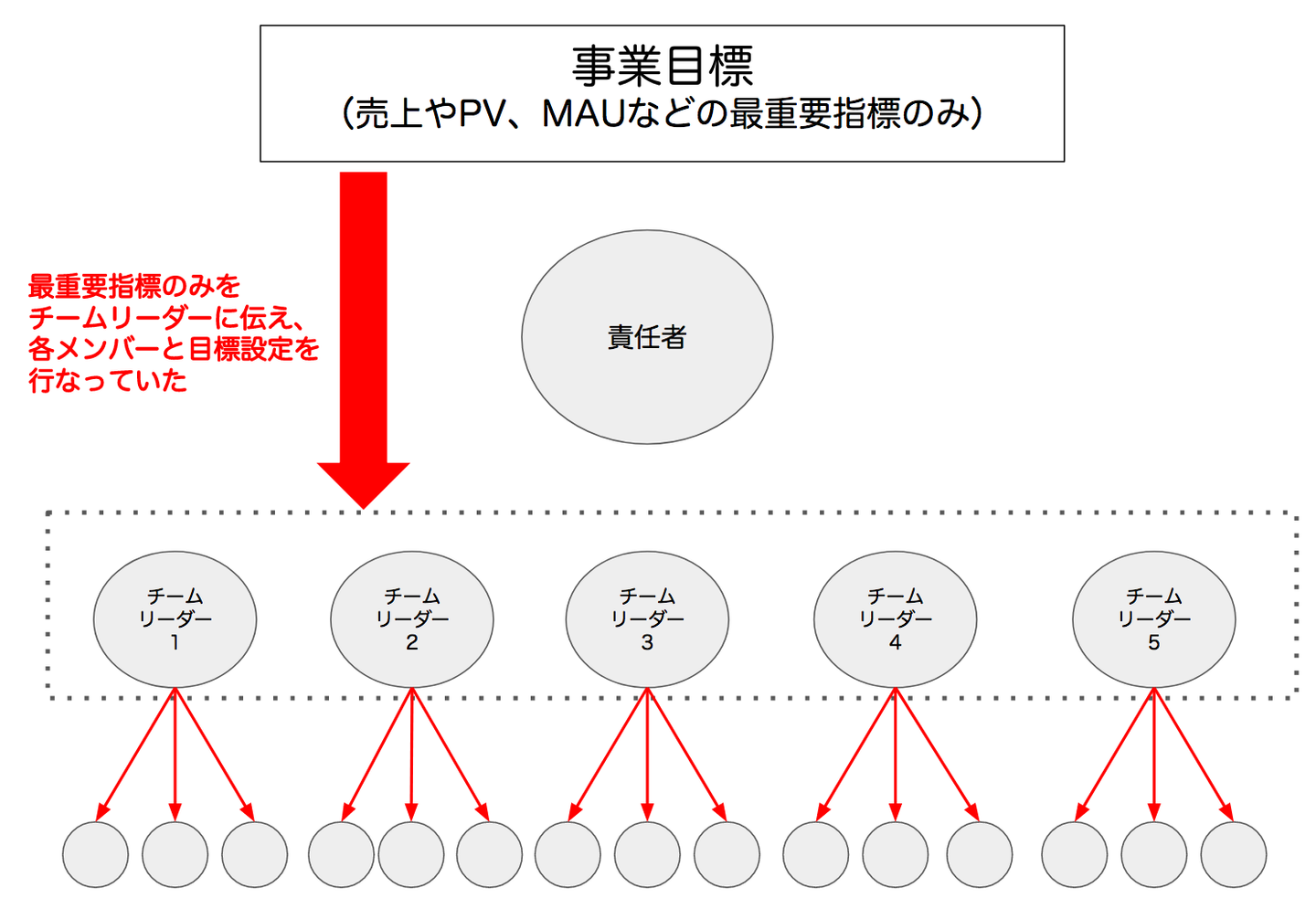 今までの私たちは下図のように、すでに決まっている事業目標(サービスによって異なるものの、売上やPV、MAUなどの最重要指標のみ)を各チームリーダーに伝え、それぞれのチームリーダーが各メンバーと個人目標を設定していました。