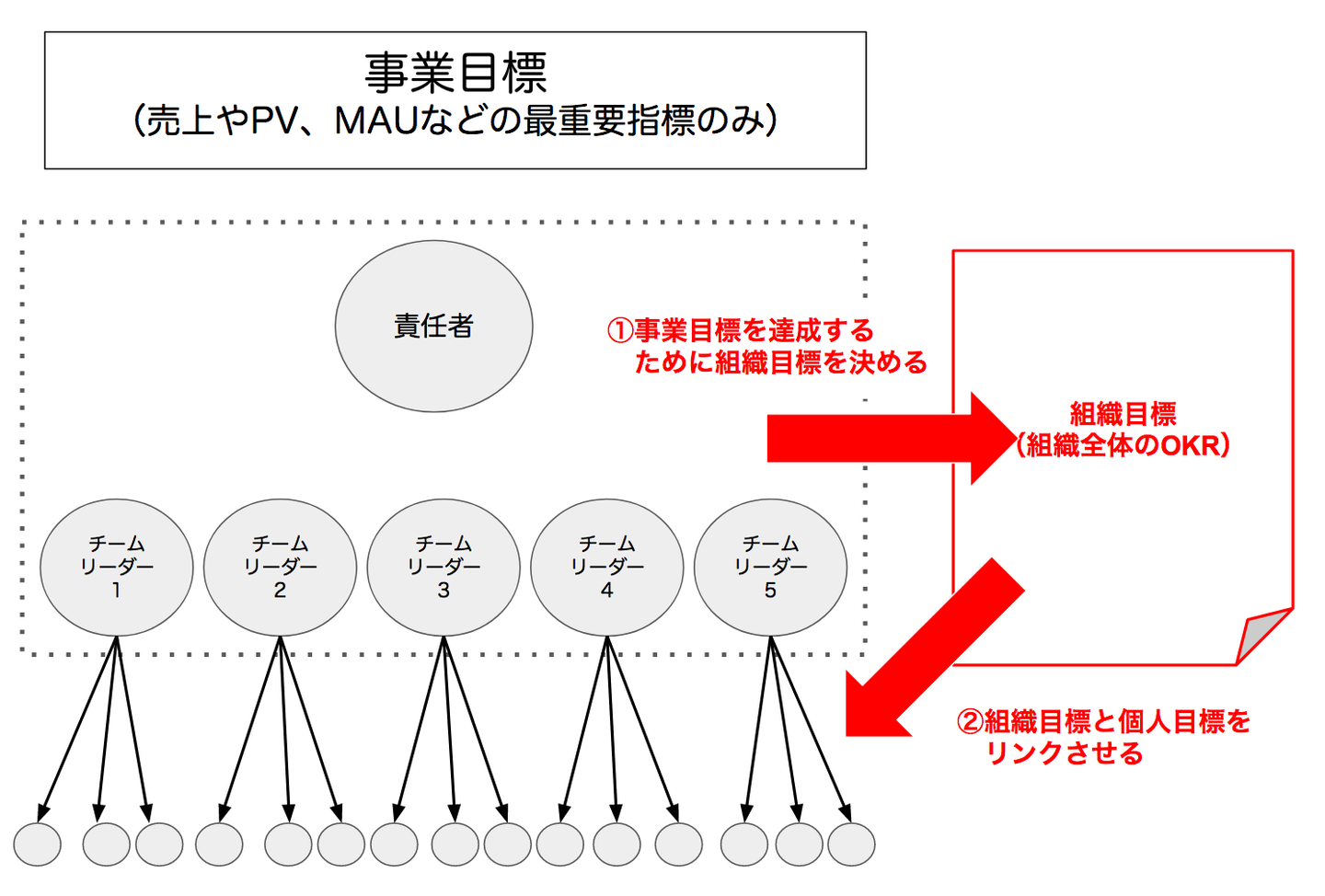 このフローだと各チームリーダーの力量に依りがちで、場合によっては個人目標と事業目標がリンクしていないこともあります。事業目標とリンクしていない個人目標はメンバーのコミットメントを引き出しにくく、評価するときにも困ってしまいます。