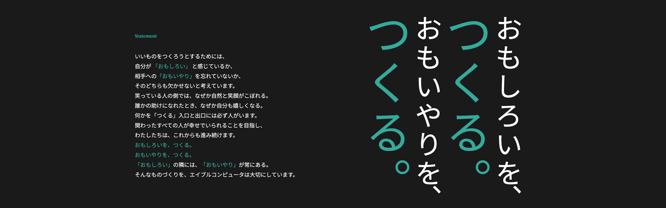 いいものをつくろうとするためには、 自分が「おもしろい」と感じているか、 相手への「おもいやり」を忘れていないか、 そのどちらも欠かせないと考えています。 「おもしろい」の隣には、「おもいやり」が常にある。 そんなものづくりを、エイブルコンピュータは大切にしています。