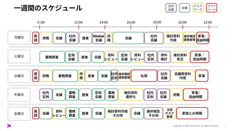 私の場合は業務移管の責任者としてプロジェクトに入ることが多いため、お客様との会議、アクセンチュア内部での会議などの時間が多めで、隙間時間で資料作成をしたりやメール、チャットへの対応をしたりしていることが多いです。