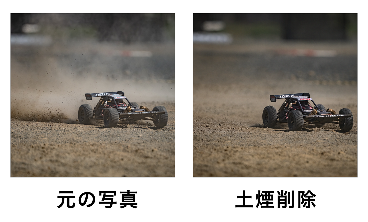 試しにAIで土煙を消してみたのですが、圧倒的に躍動感がなくなりますね…