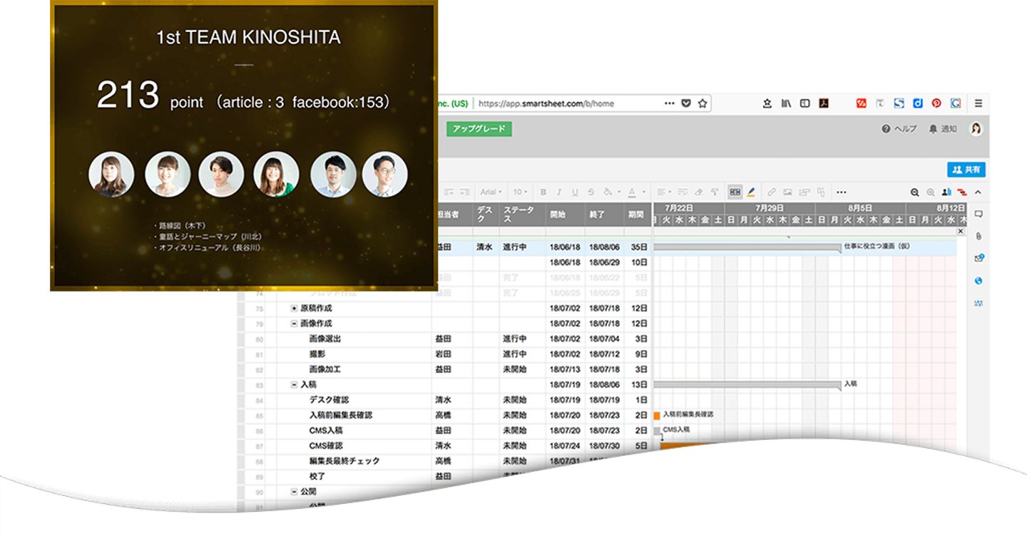 ではA.C.O.のジャーナルの編集部はどうなっているのかというと、3つのデスク(チーム)に分かれています。記事を公開すると20点、Facebookの1いいねが1点というポイント制でデスク同士得点を競っています。1年の終わりには高得点のデスクが表彰されるので、忘年会はとても盛り上がりますよ!