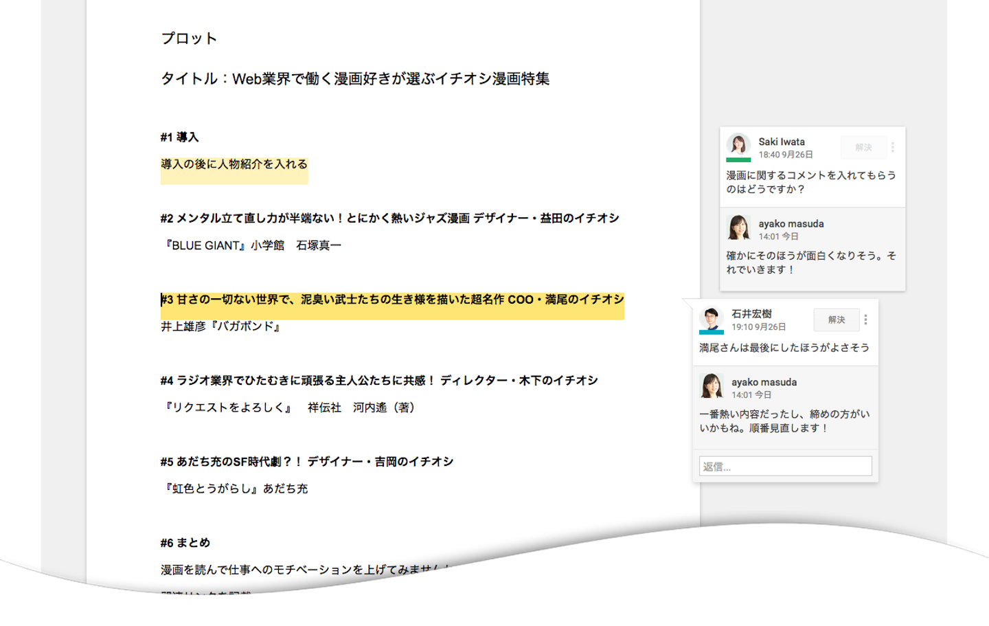 益田 :はい。この段階からインタビューのアポをとったり、紹介する漫画を教えてもらったりしつつ、プロットを作成していきました。