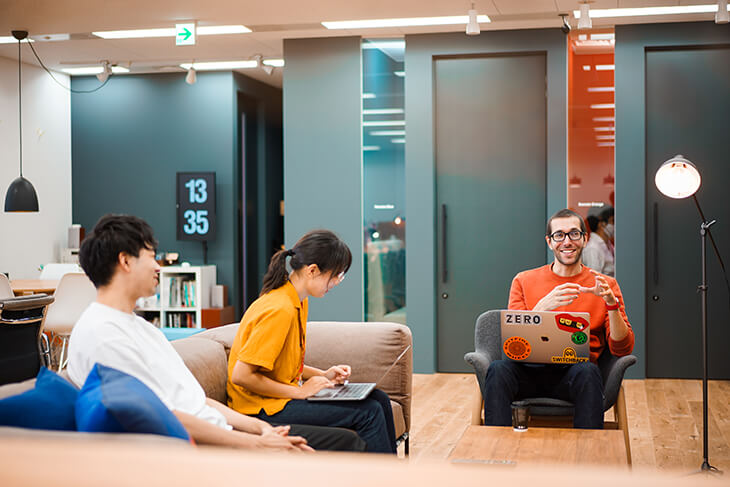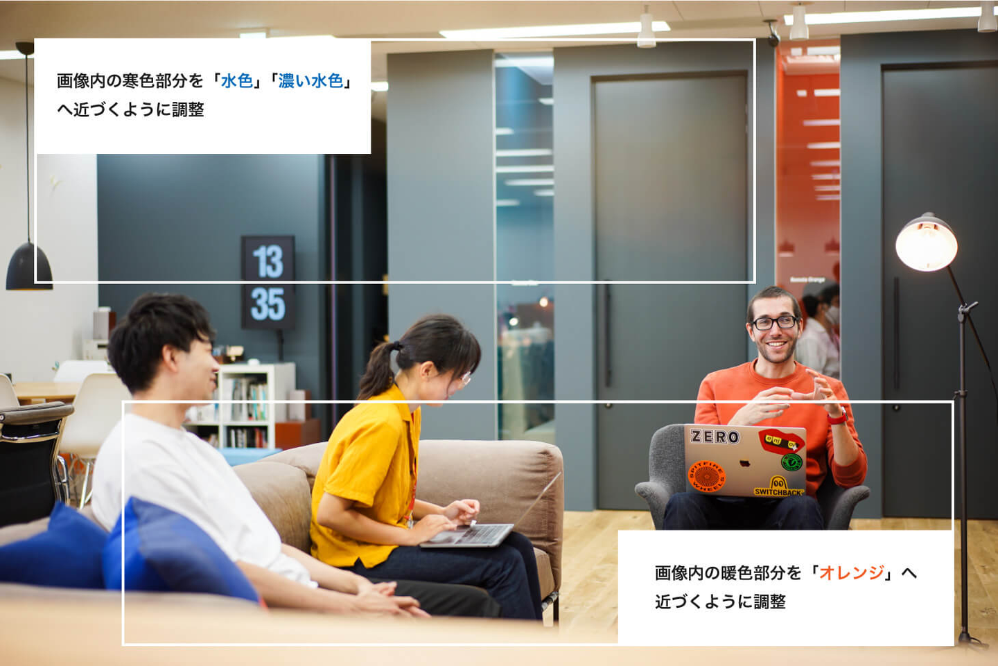 篠田 上記にならって、実際に「メインの色」「サブの色」を設定してみました。画像内をよく観察し、基本の2色を「オレンジ」と「水色」に設定し、調整しています。温かみのある人肌やオフィス内の光を「オレンジ」に近づけていきます。同様に白に近い光や寒色部分を「水色」もしくは「濃い水色」に近づくように調整していきます。色味の調整後の画像はより一層全体の印象が変化してきました。元の画像は黄色が強く、ぼやけた印象を持っていましたが、色相を基本の2色にまとめることでパキッとしたクリアな印象を与える画像へと変化しています。