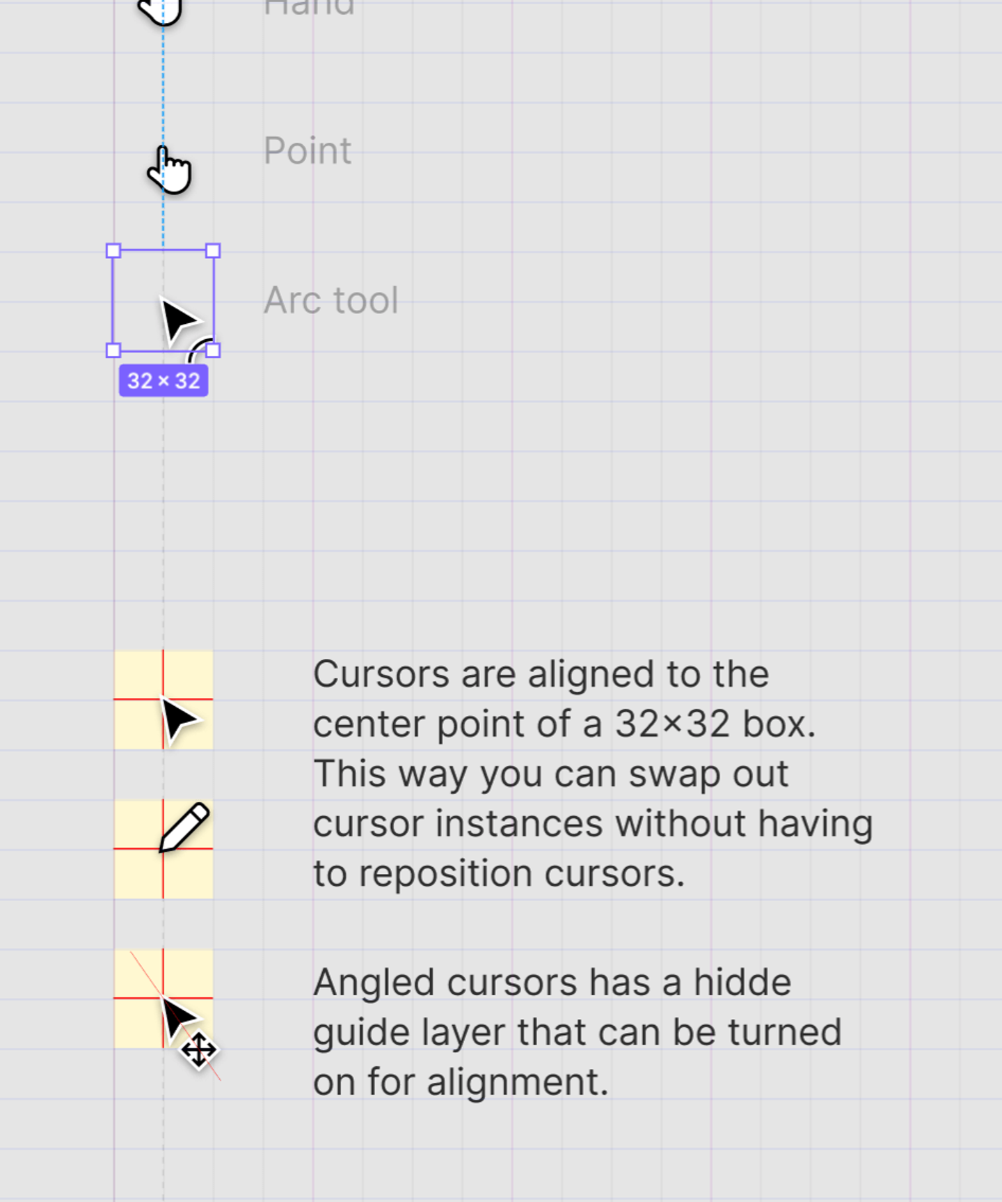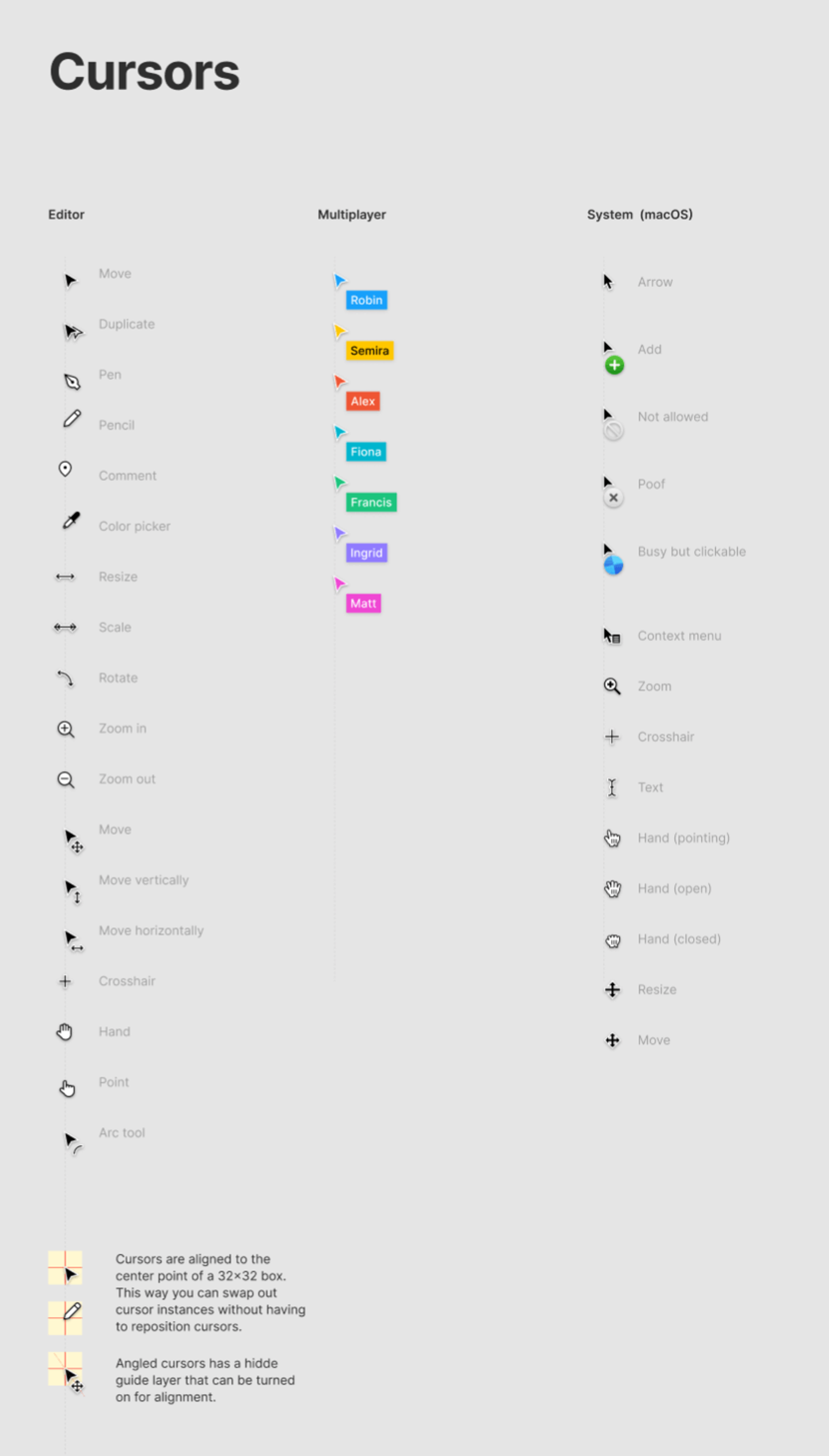 さまざまなカーソルが用意されているのもデザインツールらしいところです。カーソルのコンポーネントは中心がクリック判定の当たるポイントに位置するように作成されています。