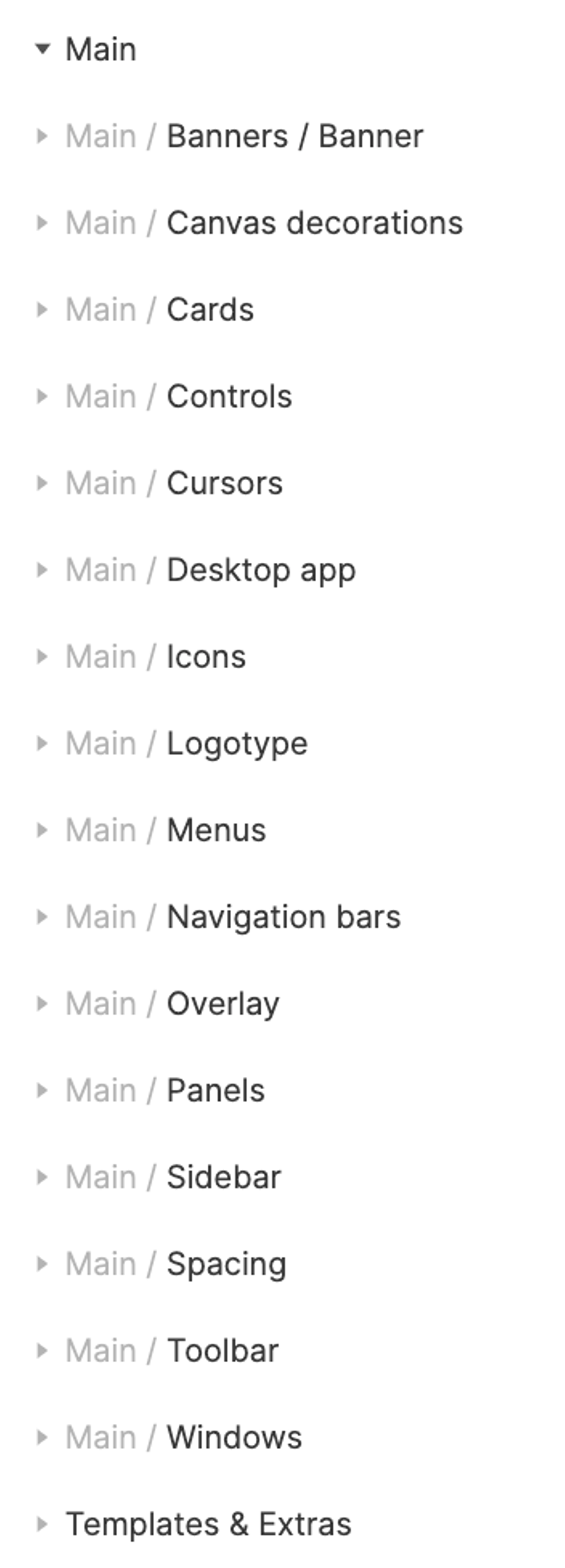 次に右側のサイドバーに移り、コンポーネントを見てみましょう。こちらもスタイルと同様あまり階層を深くせず、主要な要素を並列に置いているのが特徴です。Atomic Designのように最上位階層でレベル分けするのではなく、要素ごとにグループを作りその中で子要素を管理するようなスタイルです。