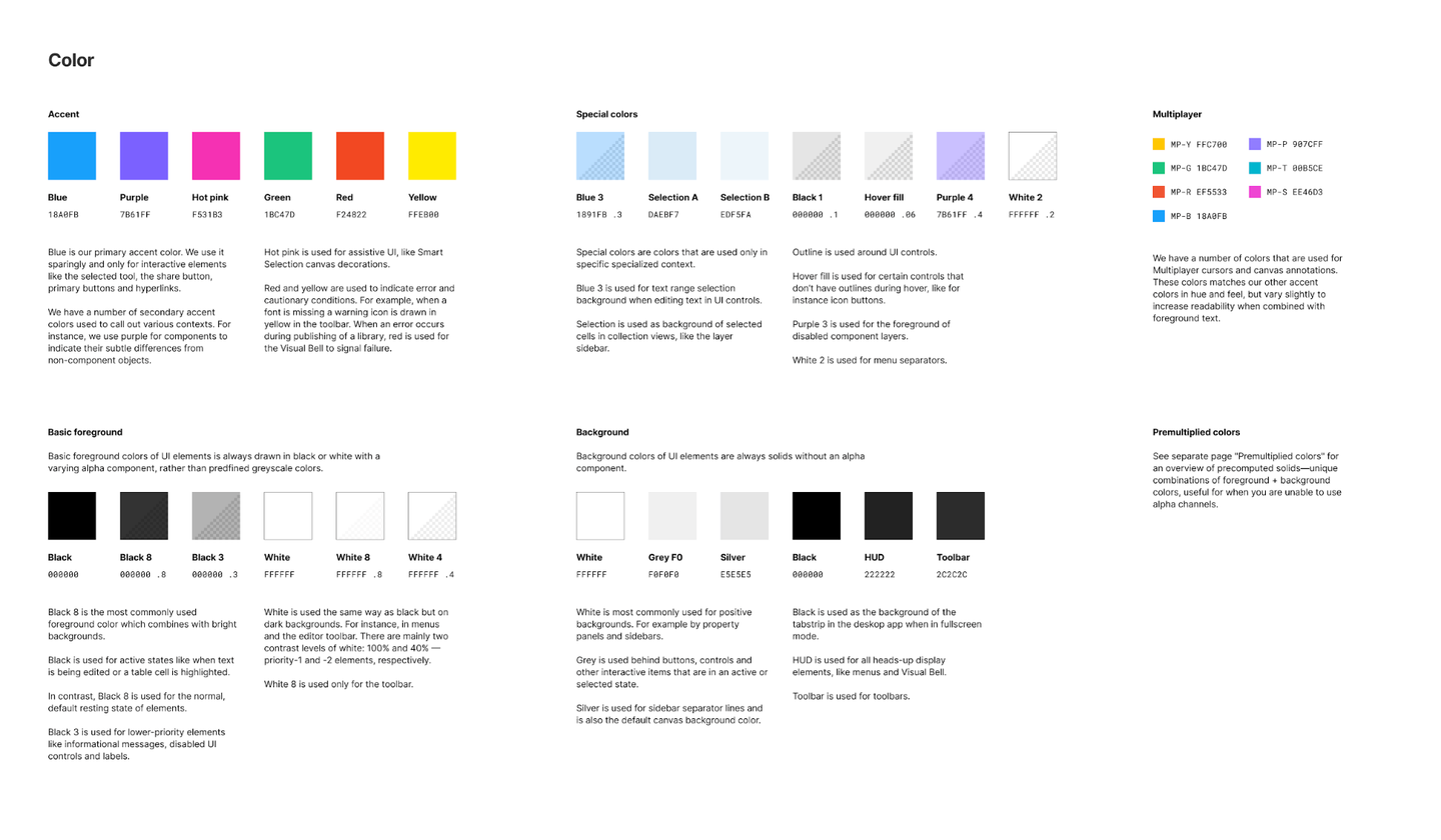 特徴は各色ごとにかなり具体性の高い使用方法を明示しているところでしょうか。Figmaという単一のシンプルなプロダクトに合わせた記述方法だと思います。一般的に大規模なサービス群やブランドを統合するスタイルガイドでは汎用性を高く保つため各色の用途を厳密に定義しすぎない傾向がありますが、それとは対照的なアプローチですね。