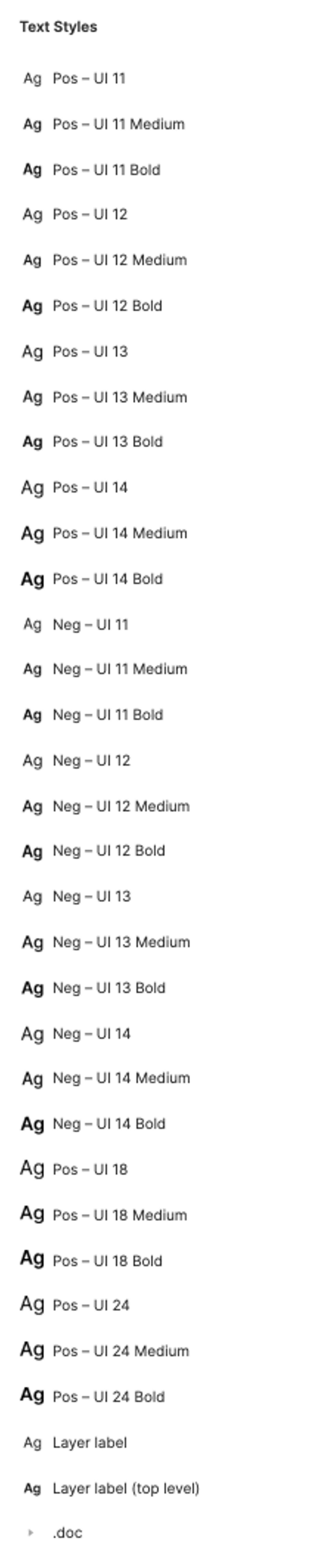 ここで一度ページの中身から離れ、右側サイドバーでデザインパネルを見てみます。大量のテキストスタイルが並んでいます。.doc というこのUI2のドキュメント用スタイル以外は階層化せず、全てフラットに並んでいます。
