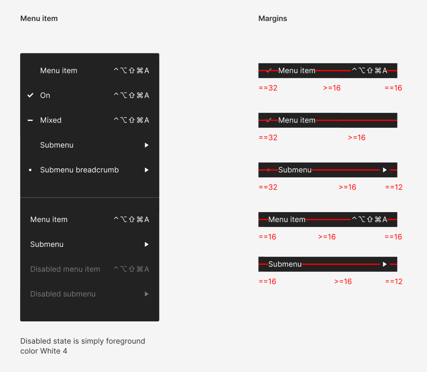 Figma左上から展開されるメニューのルールです。左側のメニュー名と右側のショートカットキーの間を16px以上にしなければならないといったルールが明示されています。