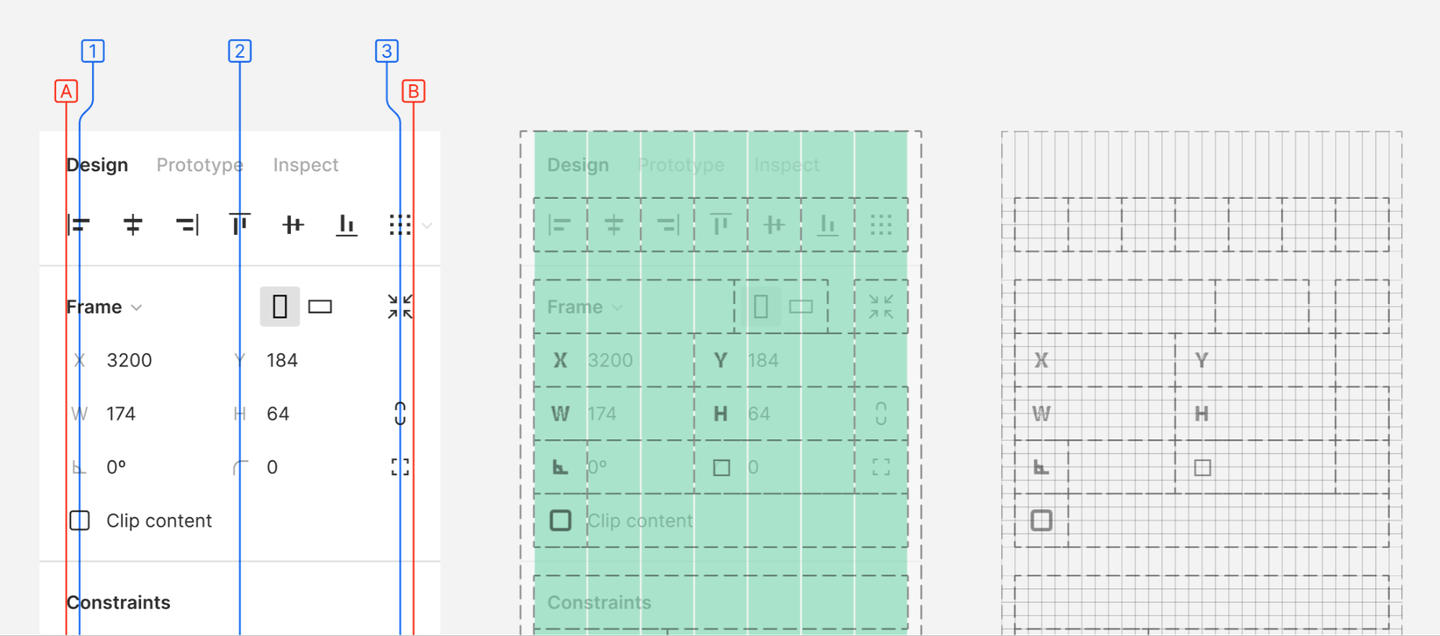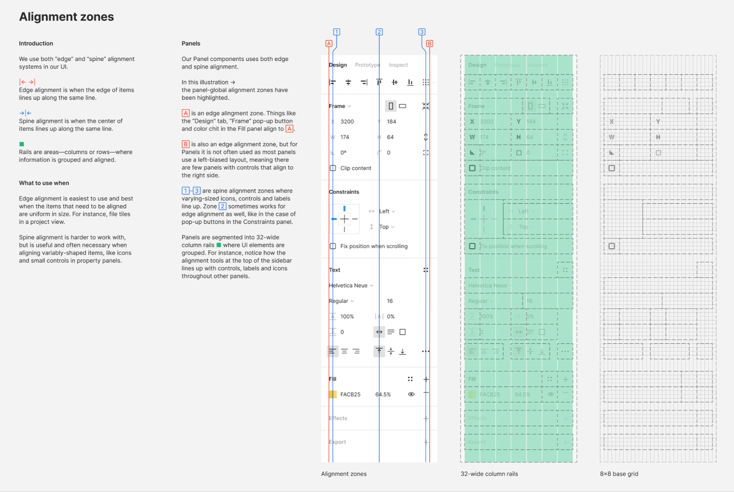 デザインパネル内の要素の揃え方が非常に丁寧に説明されています。ABの赤い線が基本になる左右揃えのライン。その中にある青い1〜3がアイコンやラベルなどを配置するときの中心線になっています。