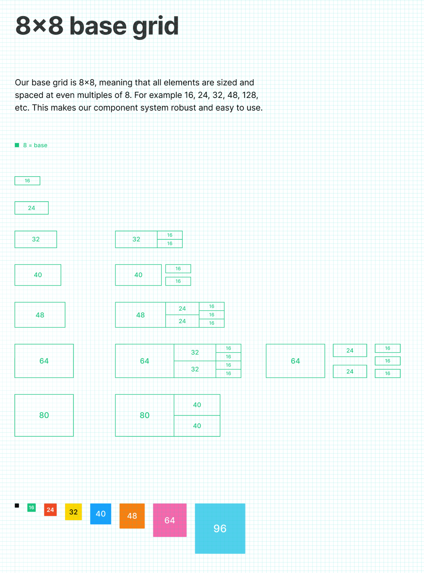 グリッドは8の倍数のグリッドシステムを採用しています。グリッドシステムは制定しても結局基本単位の倍数に収めきれずに例外が増えがちですが、「UI2」ではかなり厳密に適用されています。ページ内のコンポーネントを一通り眺めてみましたが、例外はほとんど見つかりませんでした。