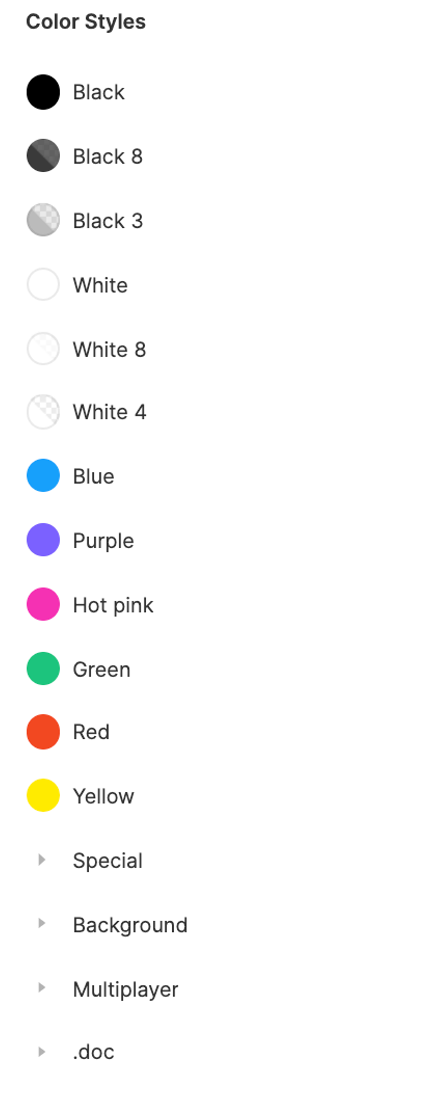 カラースタイルは主要な色が並び、さらにその下にそれ以外の色がフォルダにまとめられています。これは「UI2」全体に通して言える特徴ですが、主要な要素はあえて階層を深くせずフラットに置いておくという傾向が見えます。
