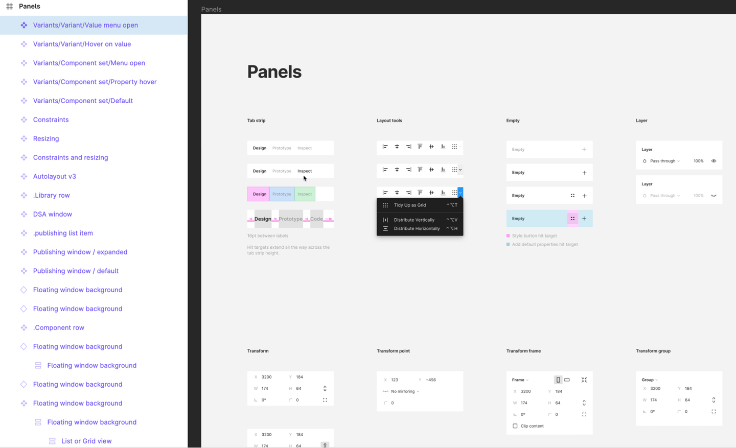 左側のレイヤーパネルや右側のインスペクタパネルなど、各種パネルが並んでいます。各コンポーネント内のレイヤーにはオートレイアウトが活用されています。
