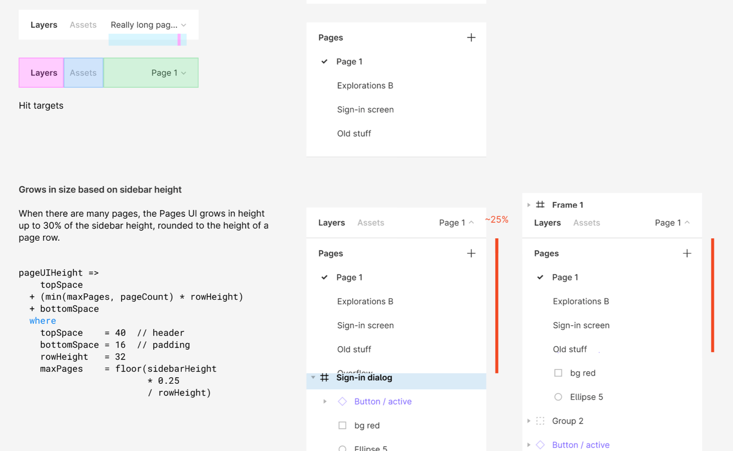 次はページとレイヤーの表示について細かい指示のある箇所。クリック判定のエリアやスクロール時の挙動、ページとレイヤーのエリアの高さの算出方法などが記載されています。