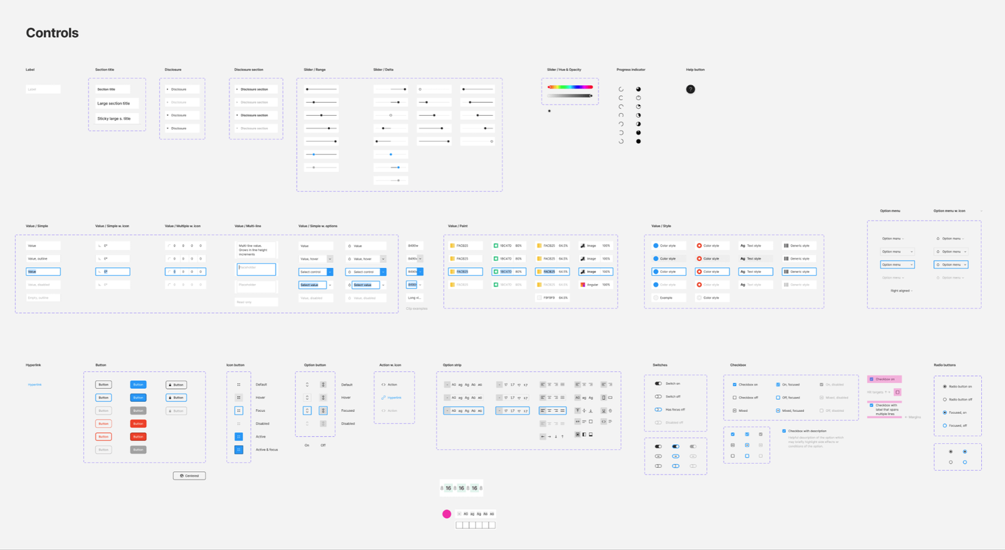 ボタン、スライダー、スイッチといった操作系のUIパーツが並んでいます。このあたりには2020年に新機能として実装されたVariantsも活用されています。