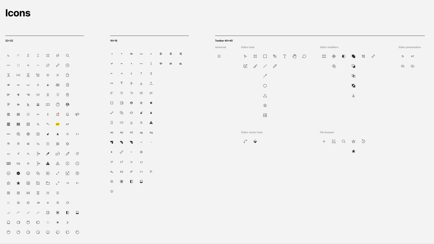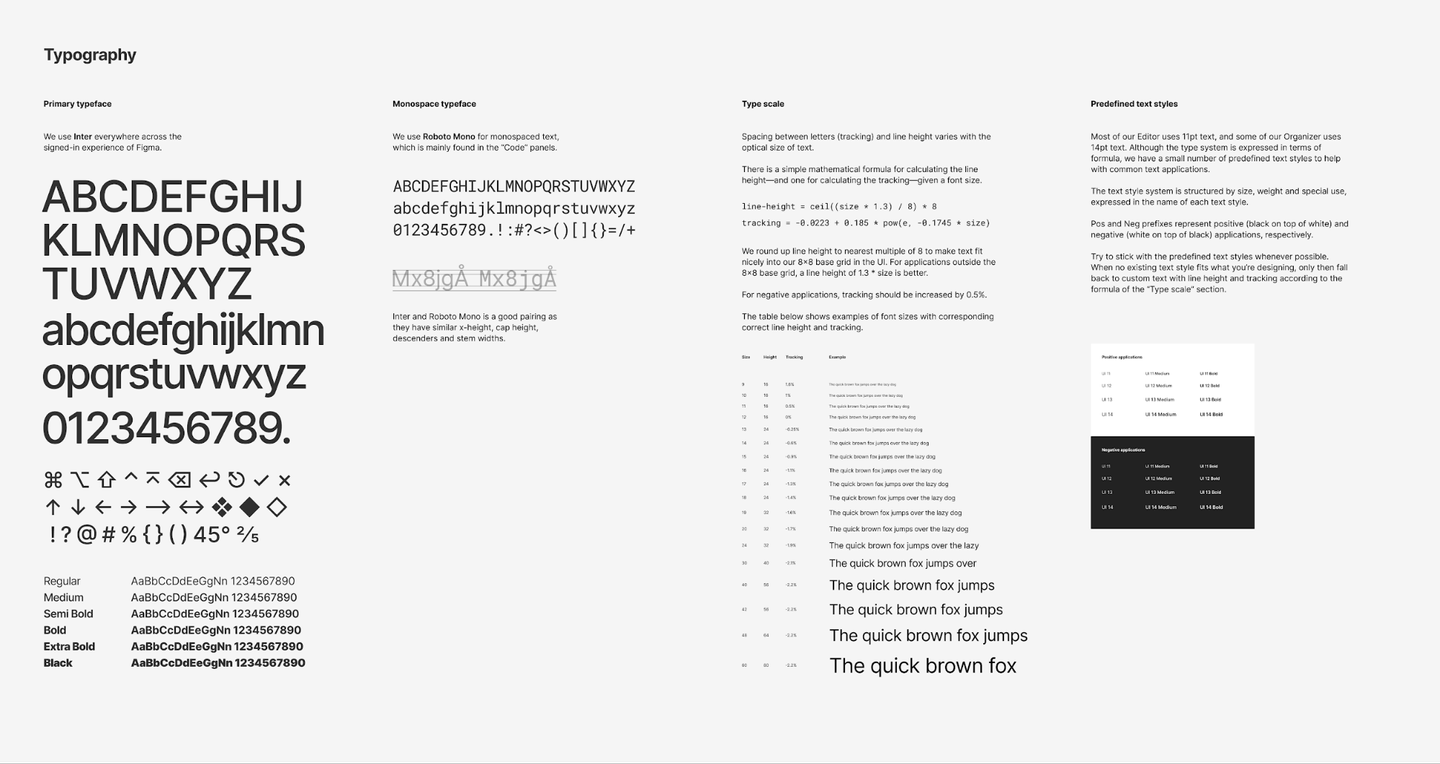 フォントはInterが採用されています。ちなみにInterは私もとても好きなフォントです。また、等幅フォントとしてRoboto Monoが併用されています。⌘(コマンド)や⌥(オプション)などの記号が並んでいるのはショートカットキーを多用するデザインツールらしい特徴ですね。