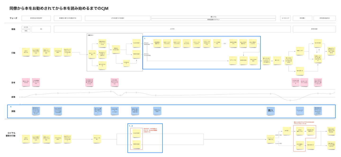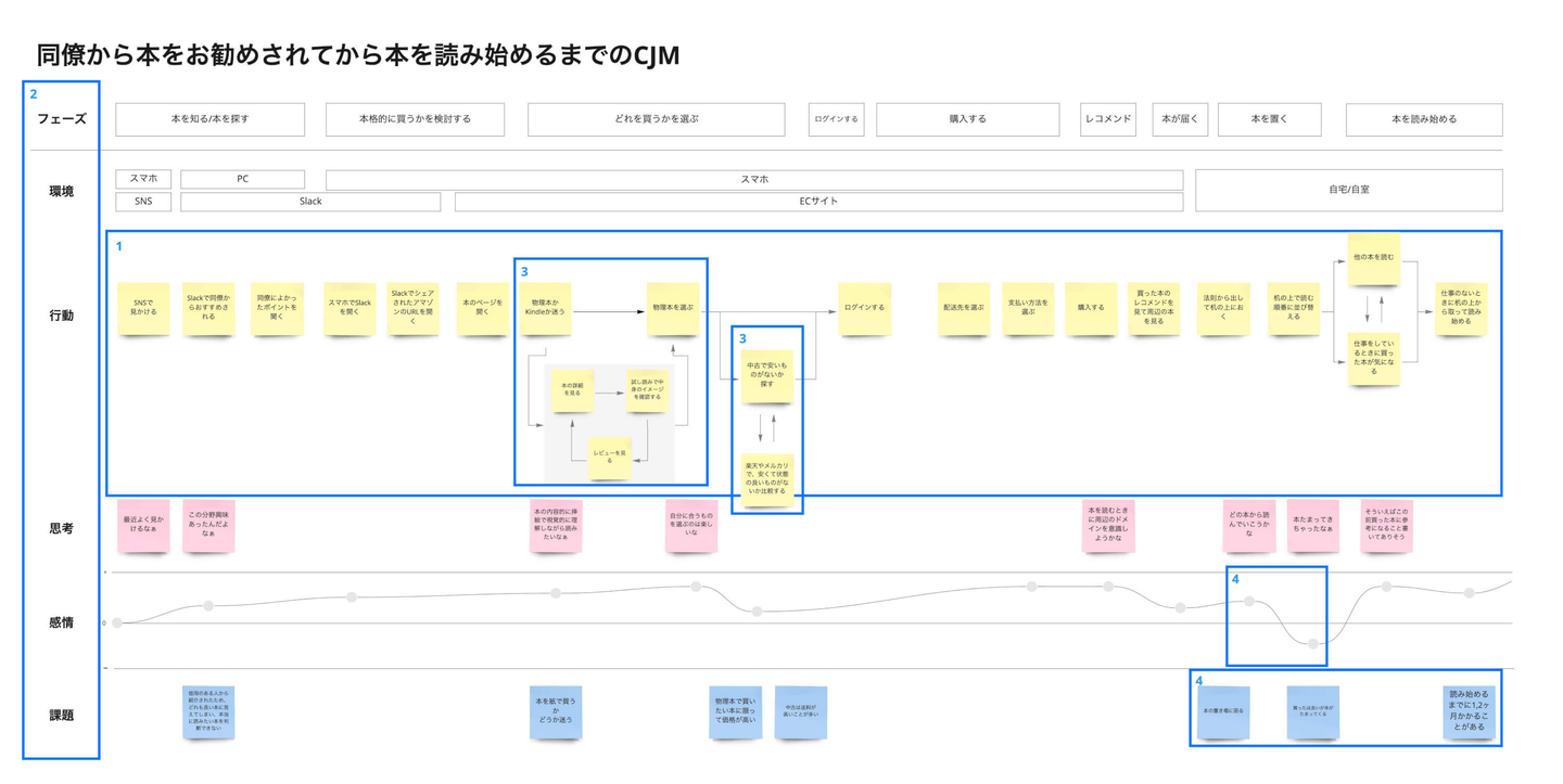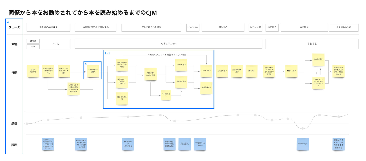 今回は、CJMの特徴を比較すべく「同僚から本をお勧めされてから本を読み始めるまでのCJM」を共通のテーマとして作成しました。以下3つの目的別CJMを紹介します。