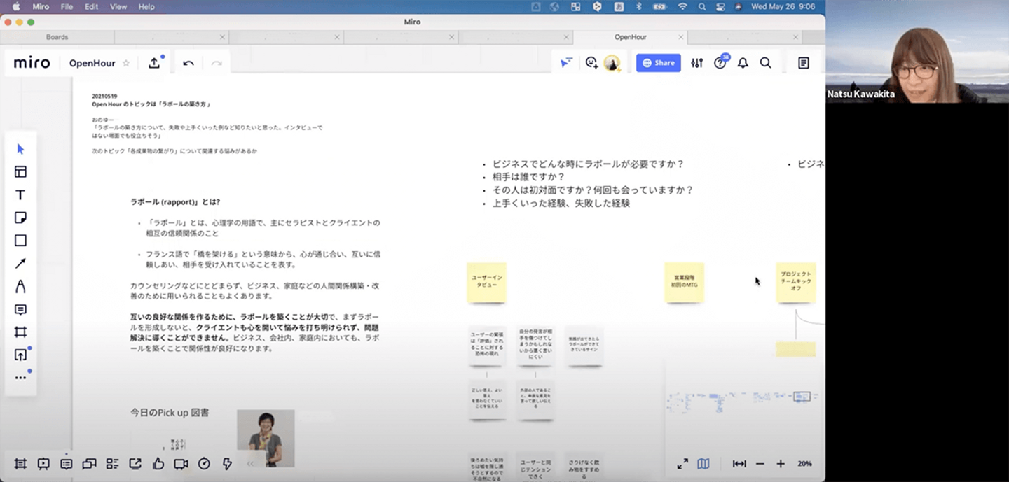 Open Hourを半年間、毎週水曜に合計20回をやってみて、トピックを選ぶのが大変なときもありましたが、部署という枠を超えてディスカッションをすることはとても有意義であると感じました。 デザイナーは、プロジェクトマネジメント、営業などいろいろな領域に関わることが多くなっているからこそ、その領域にいる人たちと話し、どのように連携できるかを考えることはとても大事なことだと改めて実感しました。