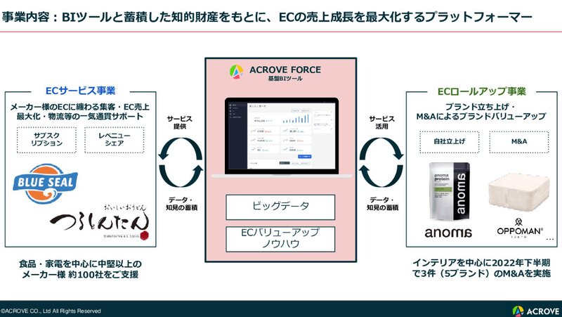 ーACROVEはECサービス事業とECロールアップ事業の2つの事業をしています。下図にもあるように、両事業をしているからこそ、互いのシナジーが生まれています。これは、単純な事業会社やコンサルティング会社とは大違いです。今後、ECサービス事業のクライアントとECロールアップ事業の自社ブランドとのコラボも実現できると思いますしワクワクすることばかりです。