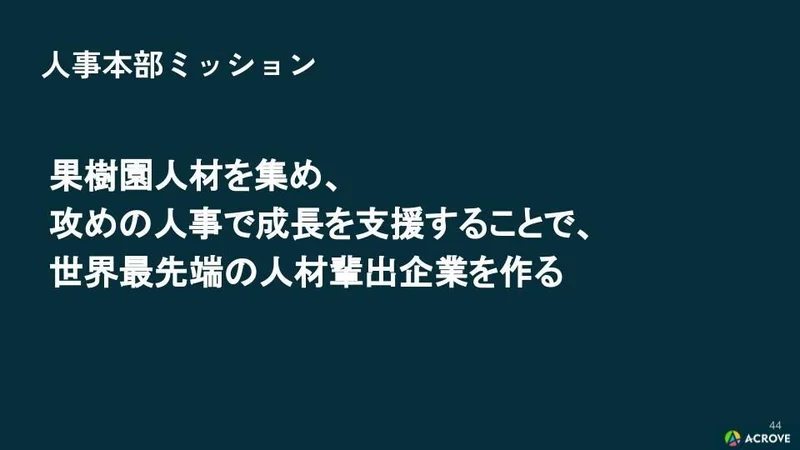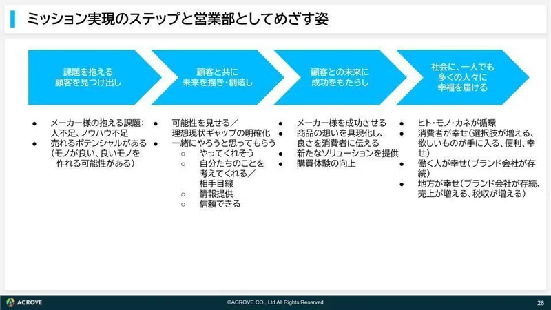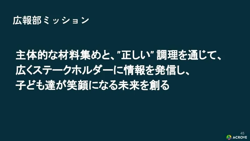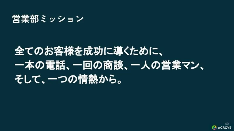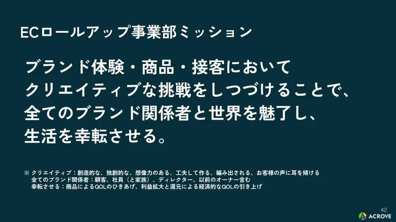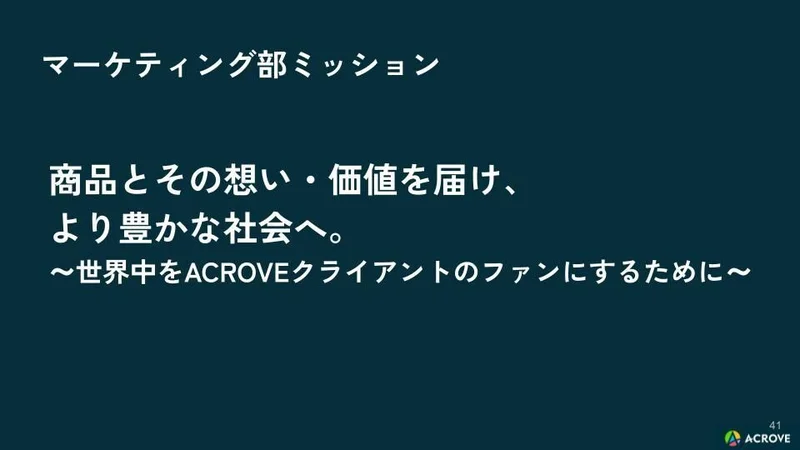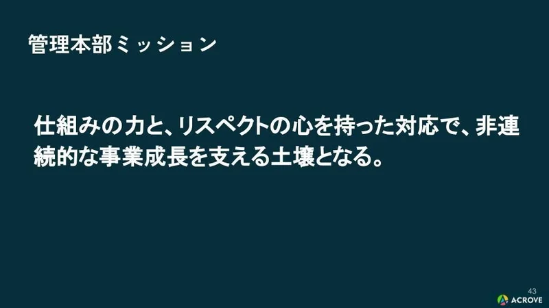 つまり、ACROVEのミッション実現のために、チームとして、個人として何ができるのかを自分事化して、考えてもらうべく、部門別ミッションを策定することにしました。