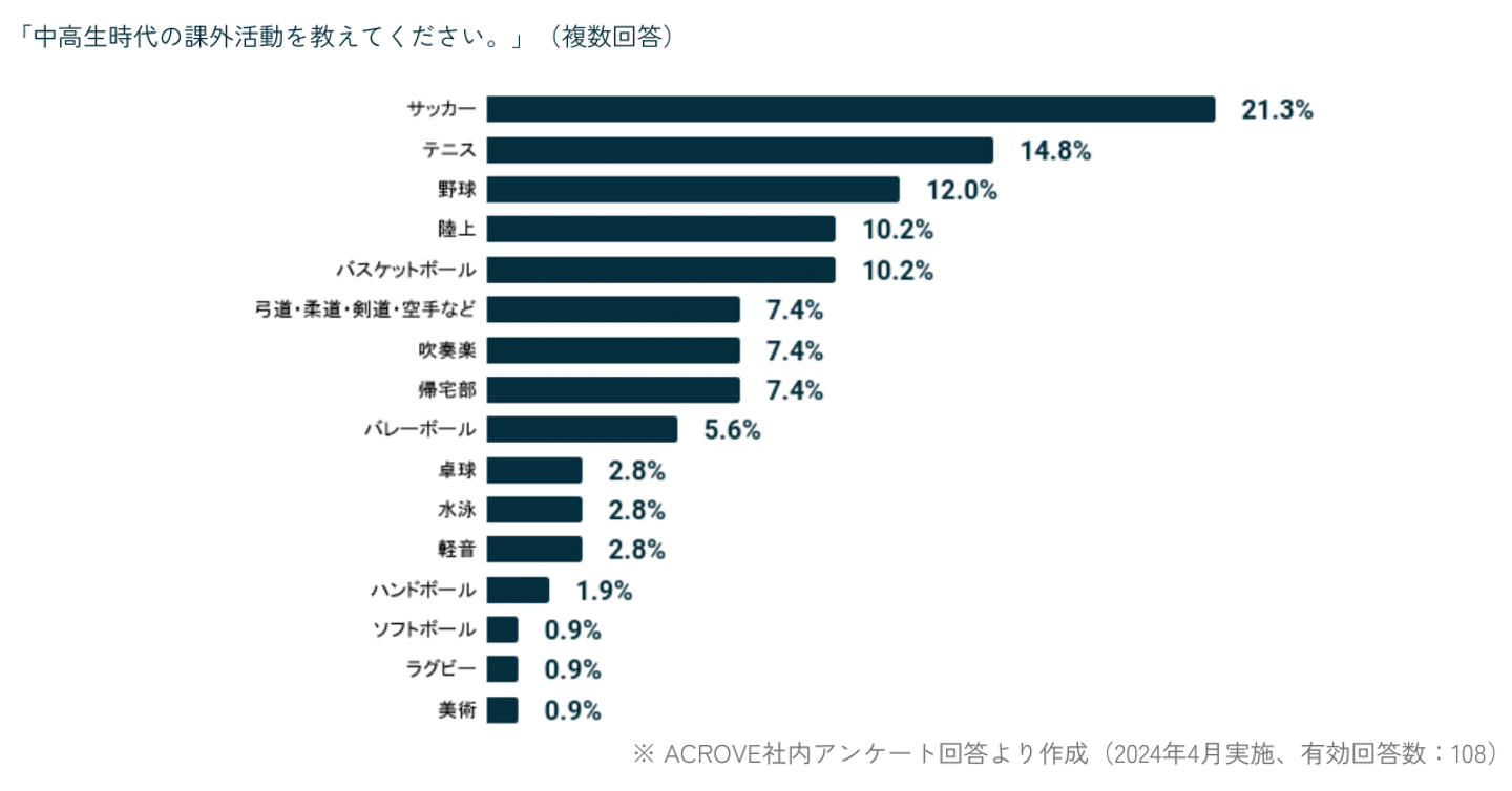 もっとも経験者が多い課外活動は「サッカー」で、約2割の人が経験したことがあると回答していました。