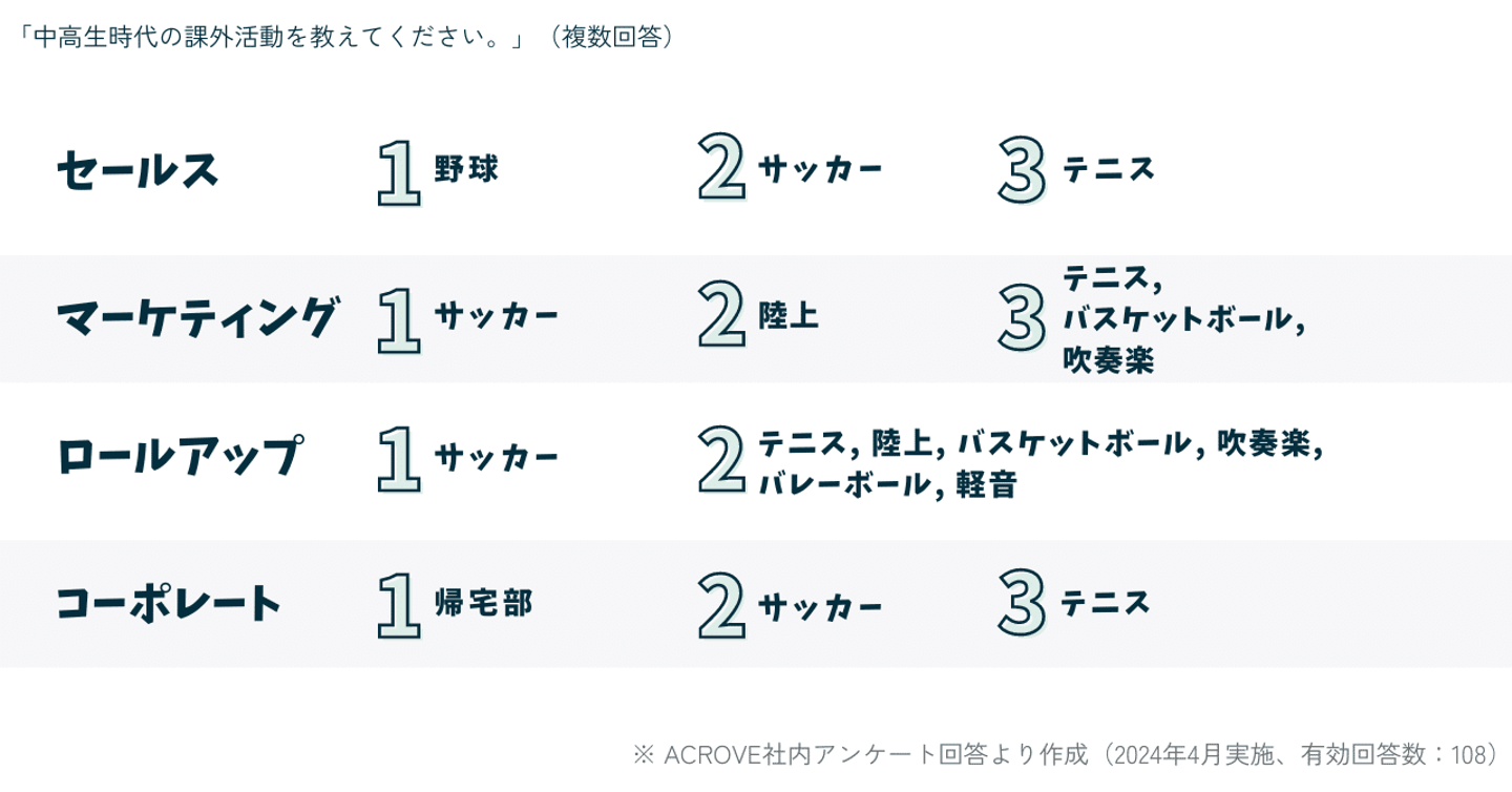 学生時代の課外活動で経験したことのあるものを、複数回答OKで聞いてみました。