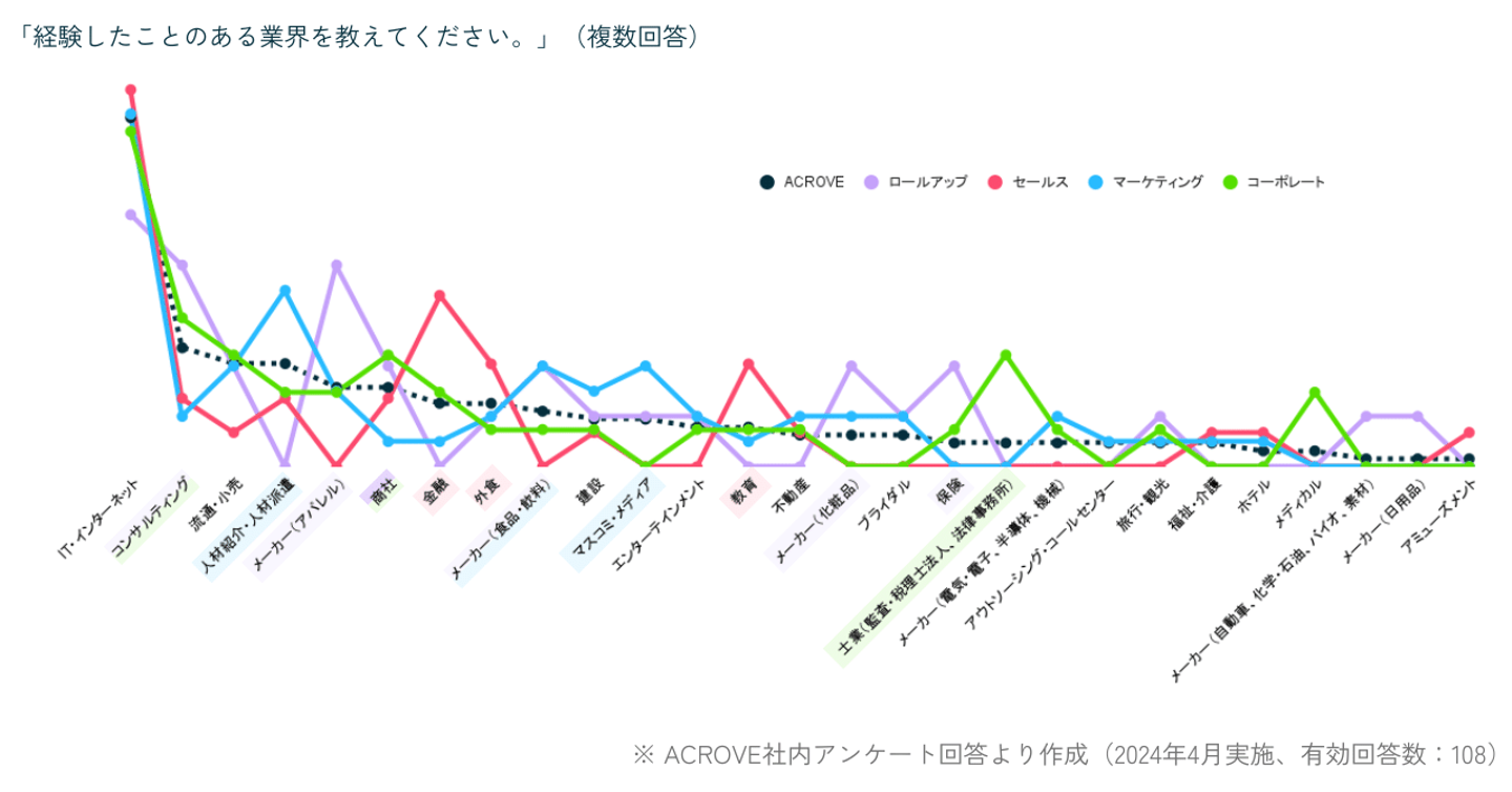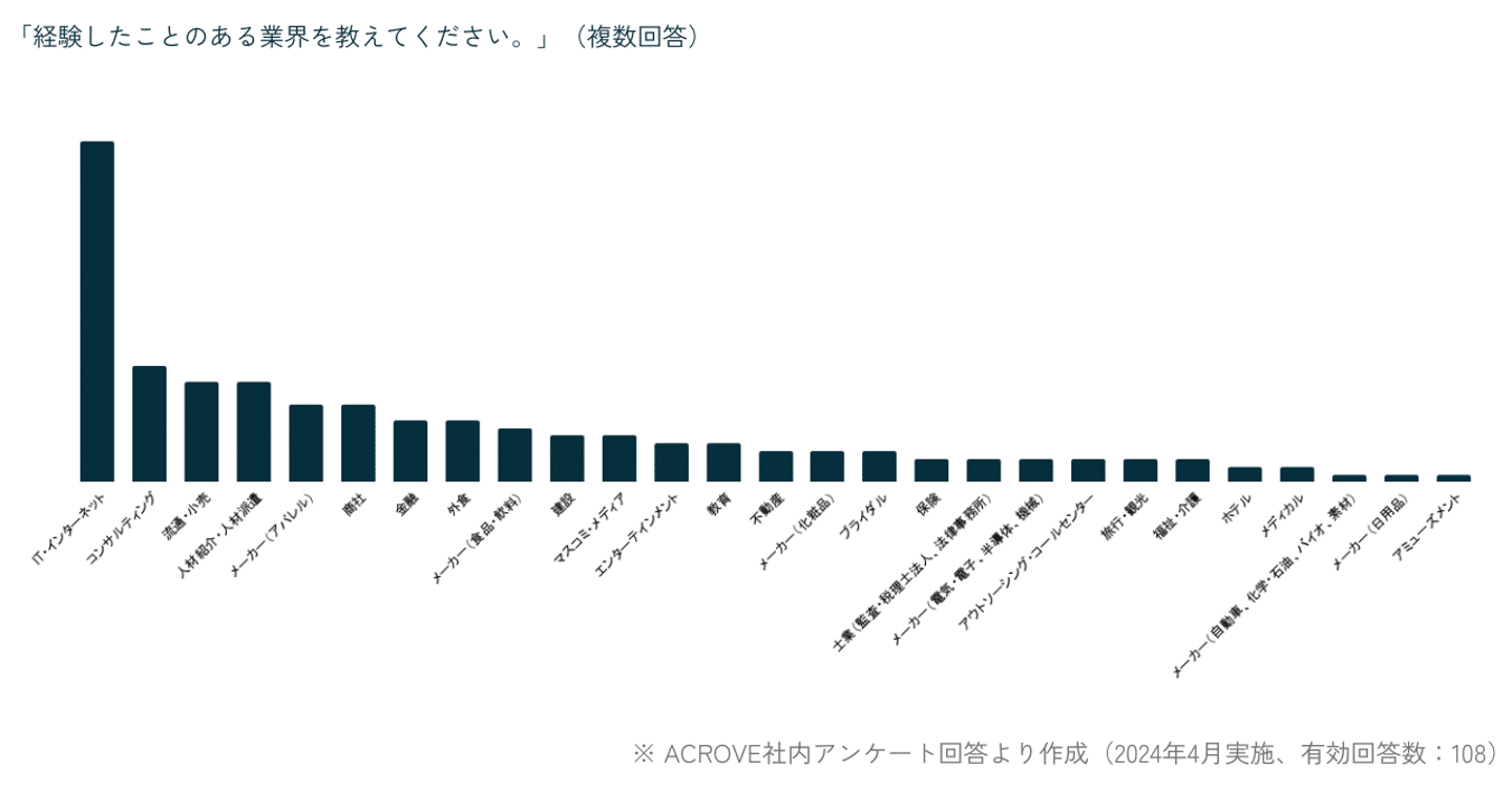 新卒以外のメンバーに対して、これまでに経験したことのある業界を複数回答OKで聞いてみました。