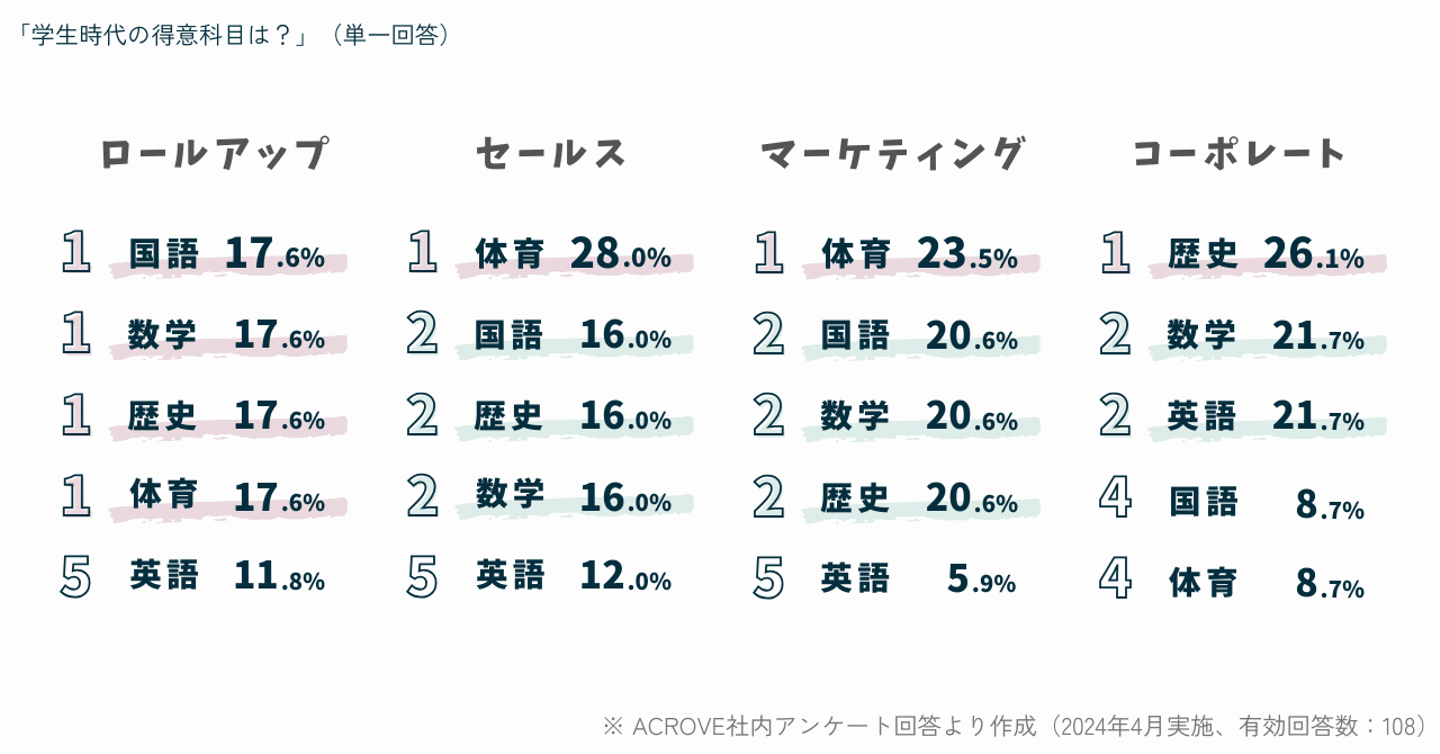 セールス・マーケティング部門では「体育」が得意と回答したメンバーが最も多く、2位に選ばれた得意科目も「国語」「歴史」「数学」でした。