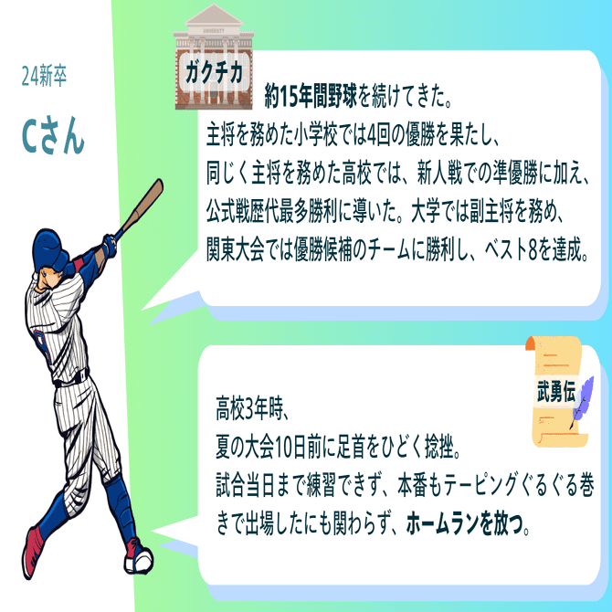 ガクチカも武勇伝も野球関連のエピソードをいただきました。