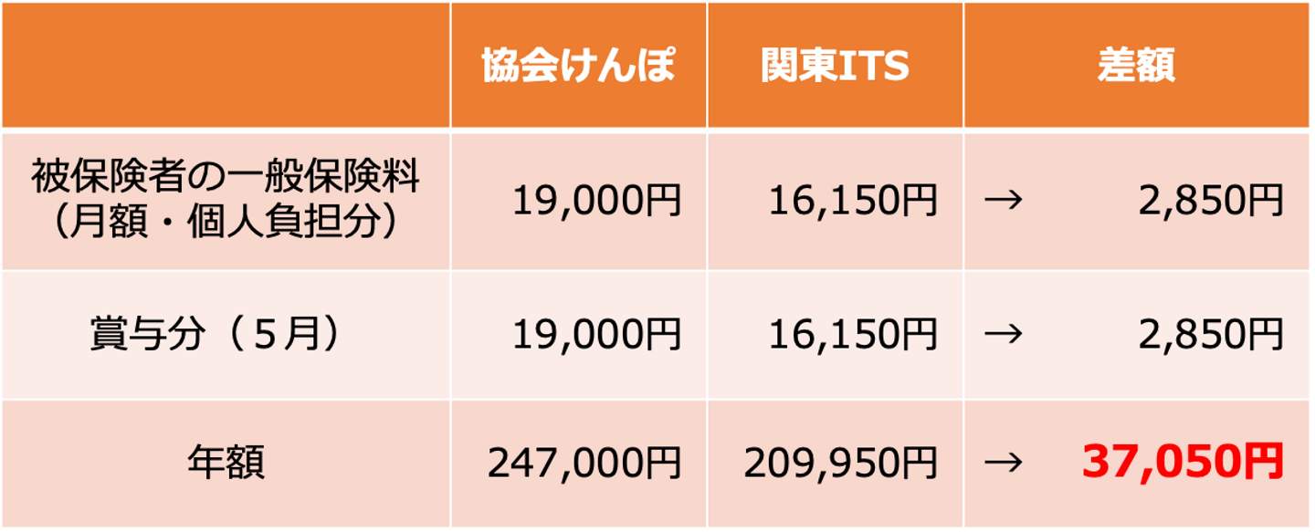 中小企業で働く従業員が主に加入しているのは協会けんぽ(全国健康保険協会)です。弊社も本年2月末までに協会けんぽに加入していました。ここで、関東ITSと協会けんぽの健康保険料を比較してみましょう。