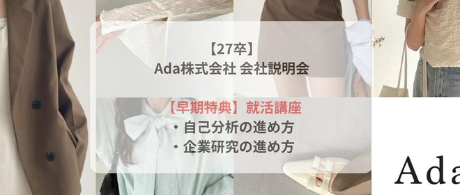 Ada(株)では、主に『ZOZOTOWN』内で展開する、オリジナル商品と他社優良ブランドの商品を厳選したファッションセレクトショップ「Ada.(エイダ)」を運営しています。 最新のシーズントレンドからベーシックアイテムまで、多様なジャンルのブランドと商品をセレクト。365日を可愛く、おしゃれを楽しみたいすべての女性へ、魅力的なアイテムを提案します。 ▼取り扱いブランド ・Ada.(エイダ) ・Éclat one (エクラ ワン) ・Good Riddance(グッドリダンス)