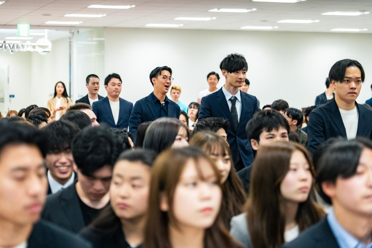 社員の温かい拍手に包まれながら、新入社員たちが入場。緊張の面持ちの中にも、期待と決意を感じさせる姿が印象的でした。いよいよ、入社式がスタートです!