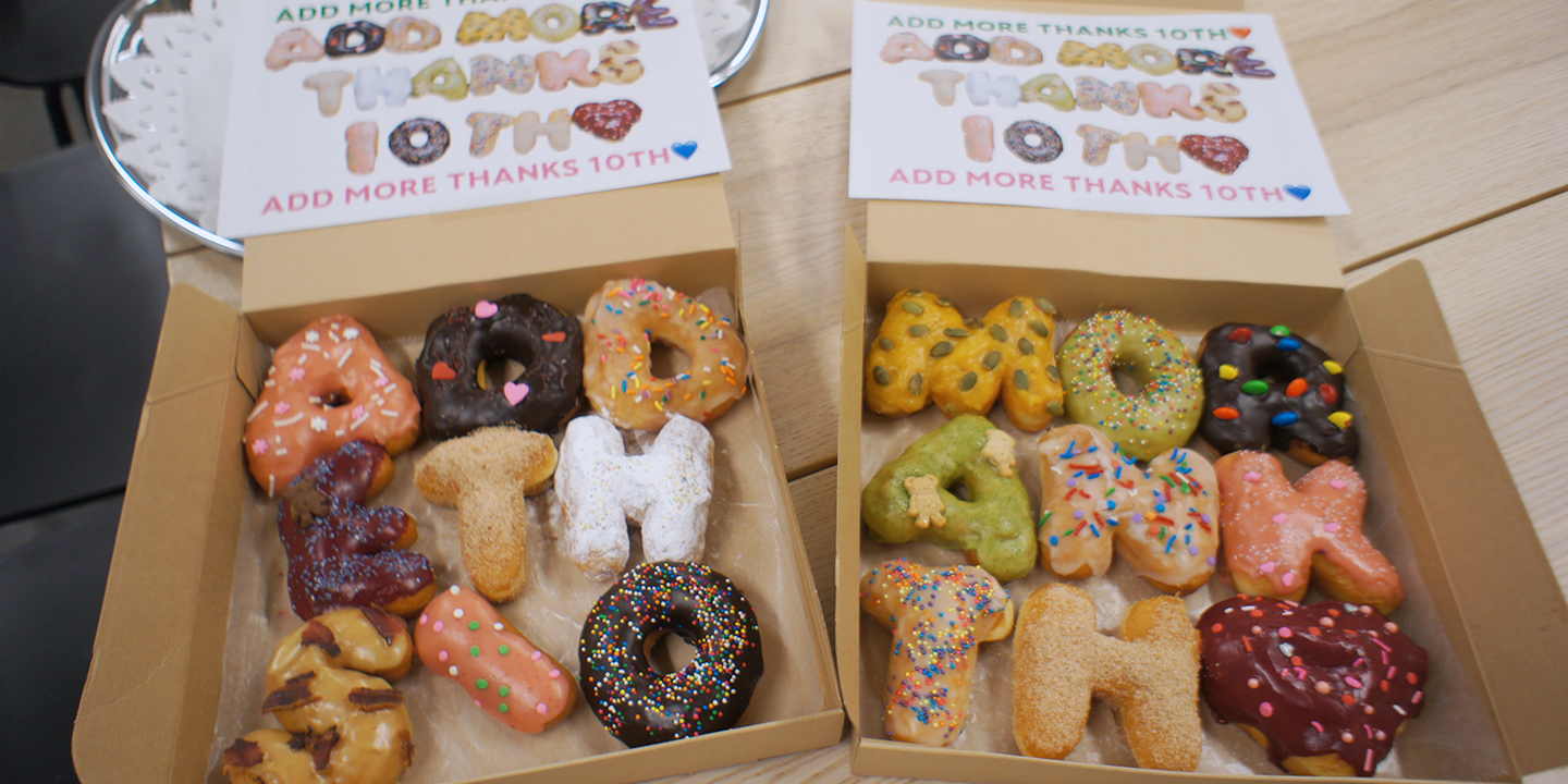ひとつづつが文字になっていて「ADD MORE THANKS 10TH❤️」と書いています。食べるのがもったいなくて食べられないと思いきや、おいしいと好評でした。