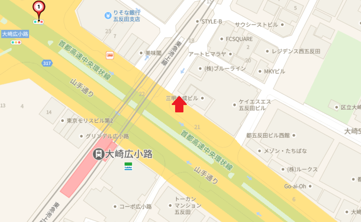 ちなみに、青いライン高架橋右手のところが東急池上線の「大崎広小路駅」です。