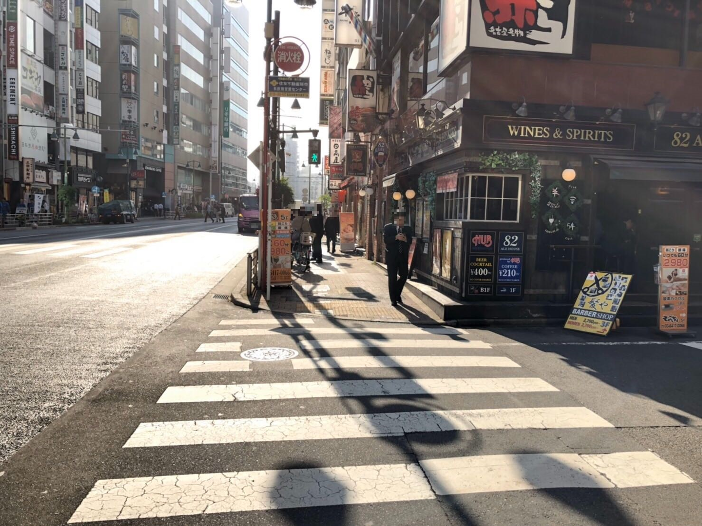 西口から出たら左に進むと、右手に一つ目の横断歩道があります。