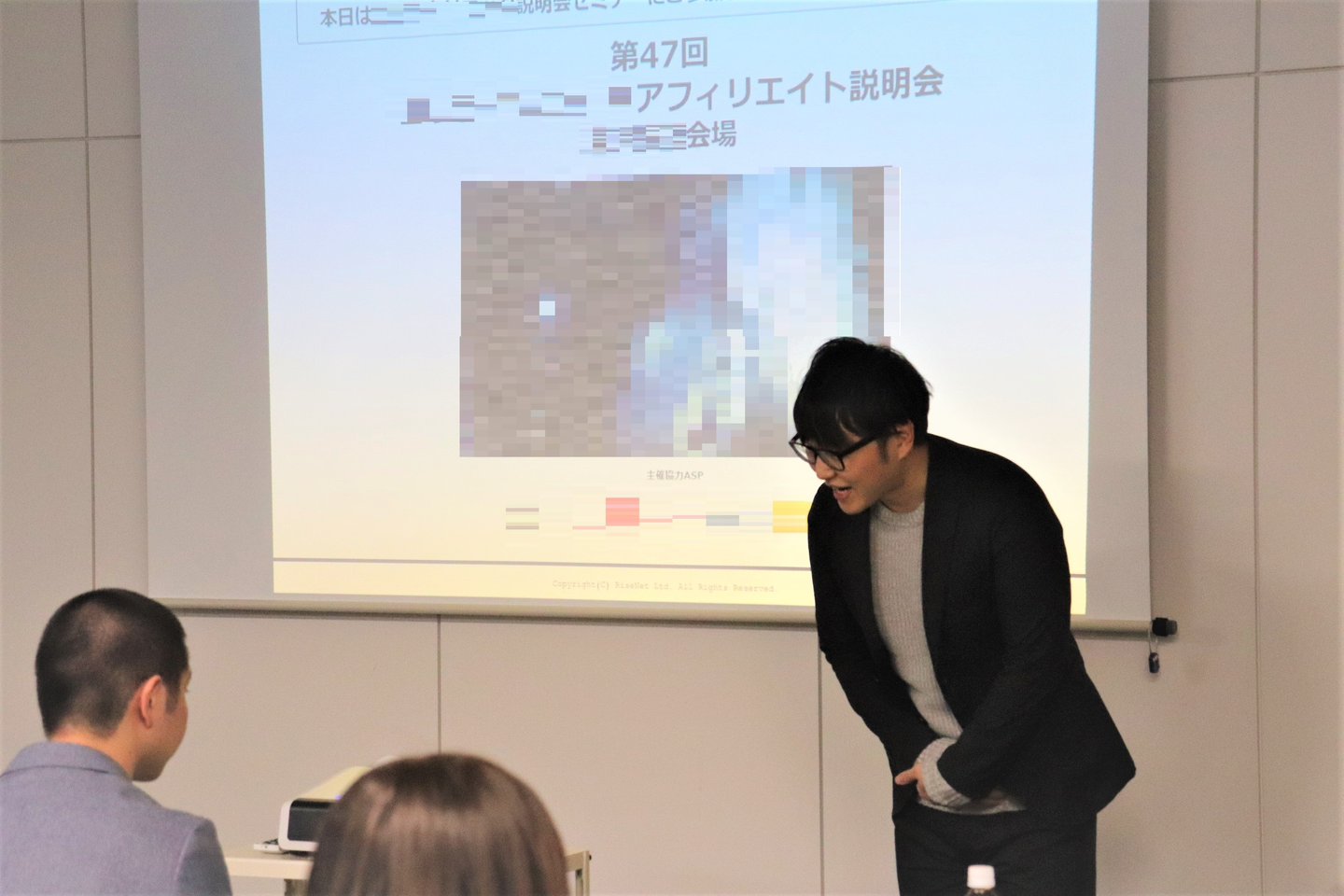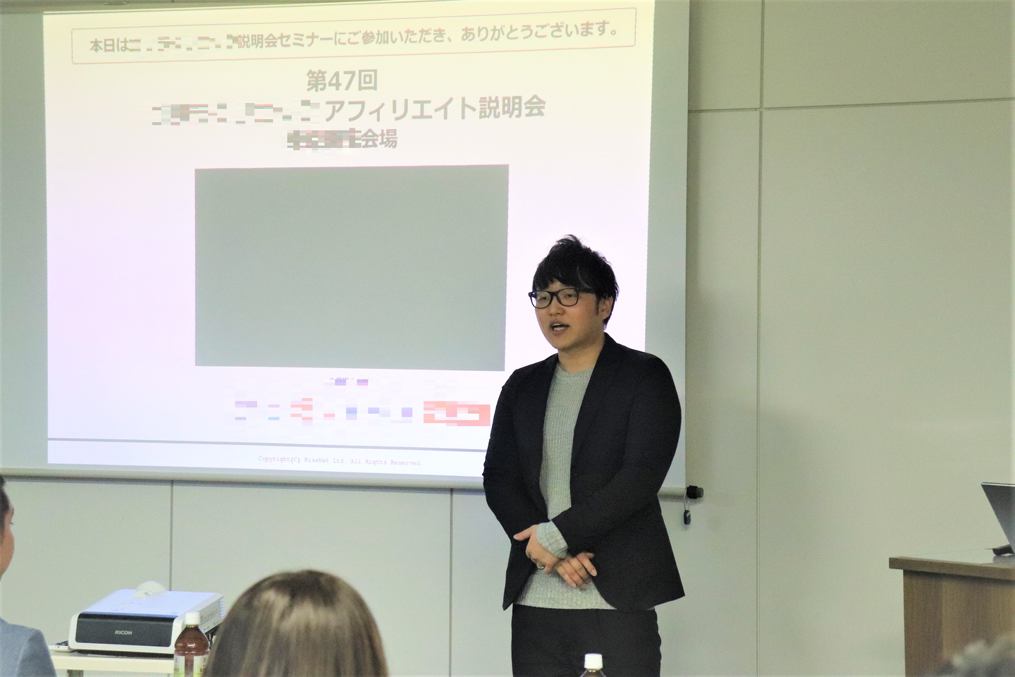 このセミナーはクライアントさんのサービスをアフィリエイターの方々にADrimの社員が講師となってお話するというものです。資料とスライドを基に、クライアントさんの概要はもちろんのこと、「ブランド認知度を高めるためのインフルエンサーマーケティング」や日本におけるクライアントさんの業界の今後などについて説明がされていきます。