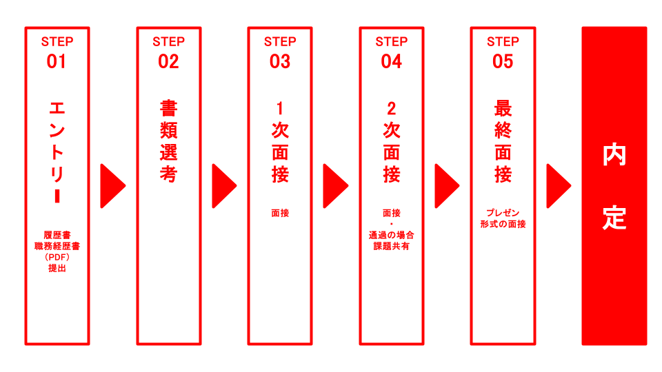 エントリーに際しては、履歴書と職務経歴書をご提出いただき、書類選考を実施いたします。