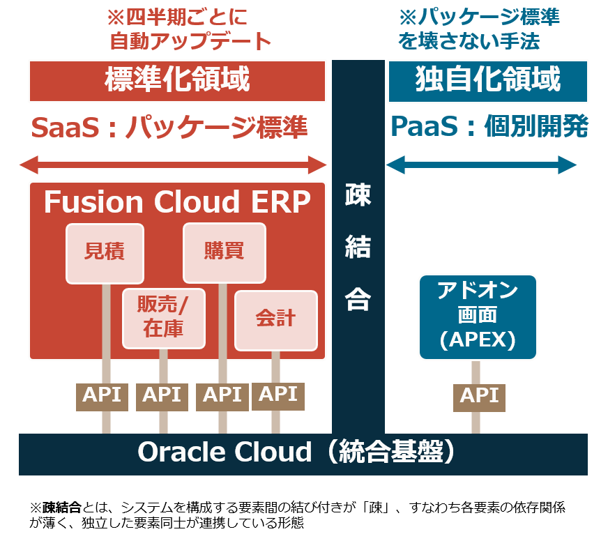 もちろん、「絶対」という言葉はないのですが、疎結合だからこそOracle社のERPを活用することでSaaSの強みであるバージョンアップ(Oracle社では四半期アップデート)に対してアドオン開発の影響が少なくなることは、企業にとっても大きなメリットになるでしょう。