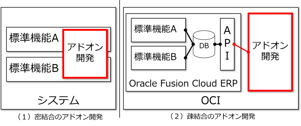 (1)を見てもらうと、アドオン開発が標準機能と密接になっていることに対して、(2)では標準機能を邪魔しない状態でAPIなどのインターフェースがクッションとなりアドオン開発と疎結合になっていることがわかります。