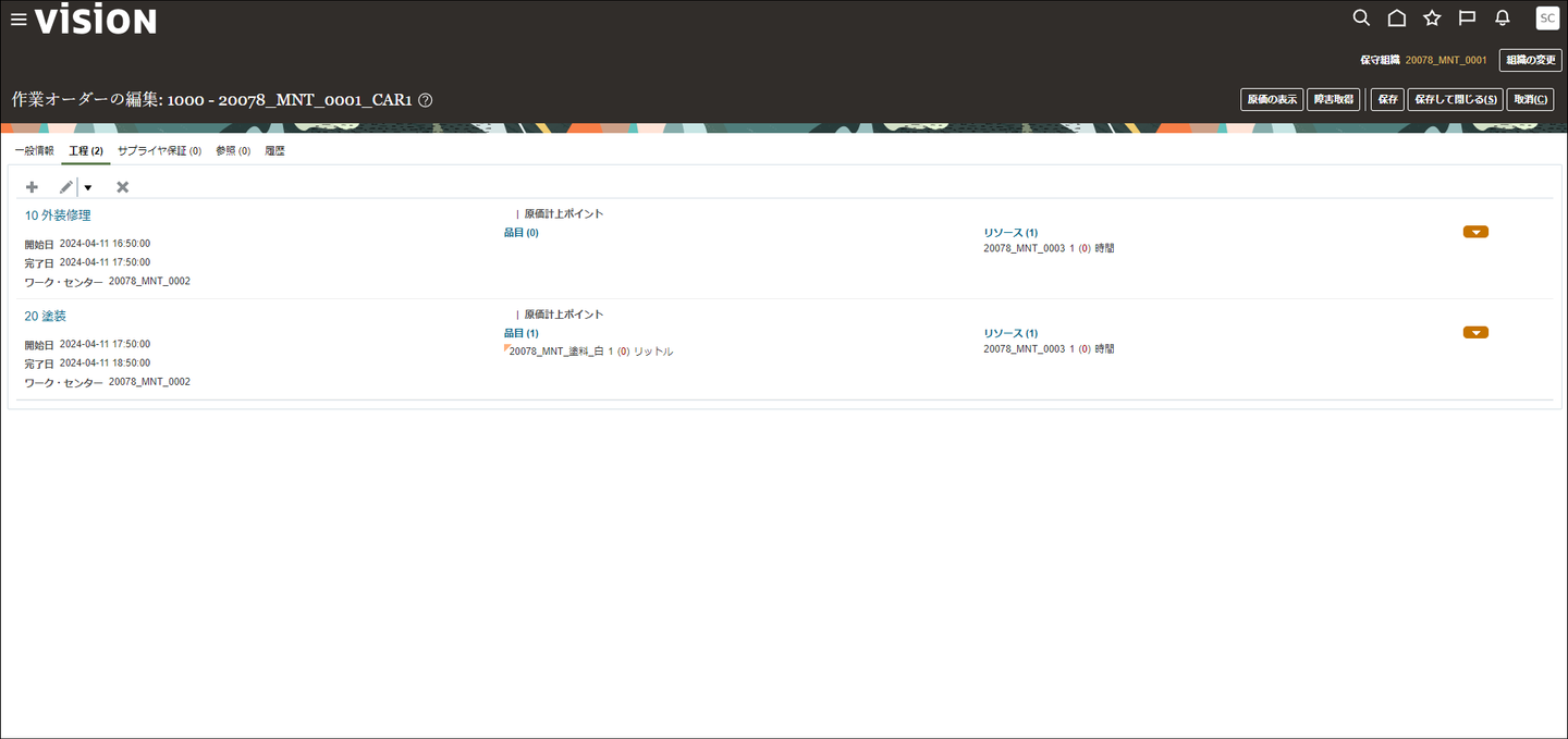 下図が「保守作業オーダー」で工程を管理する画面です。
