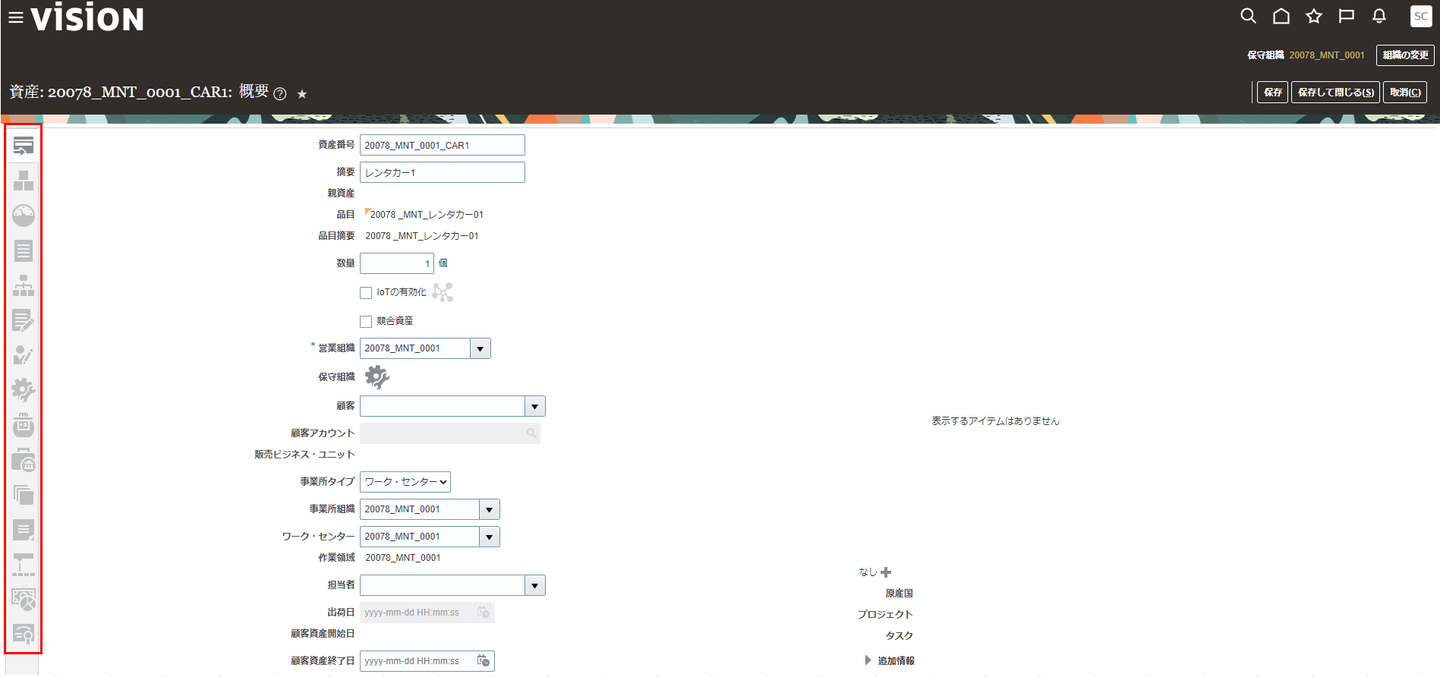 下図が「アセット(所有機器)の管理」画面です。アセットの基本情報から、保守パーツ情報、組込メーター情報など多岐にわたる情報を管理します。