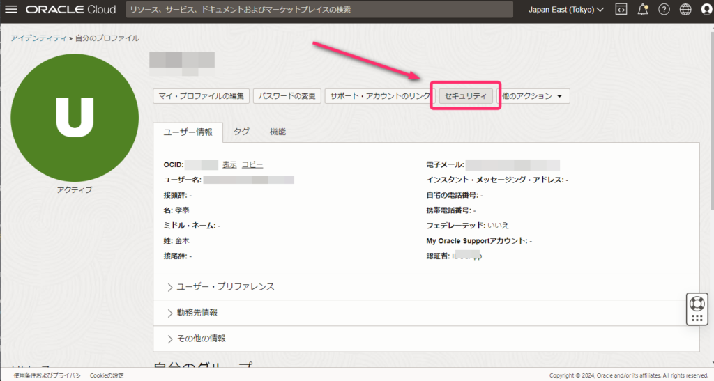 プロファイル画面が開きますので、赤枠の「セキュリティ」ボタンをクリックしてください。