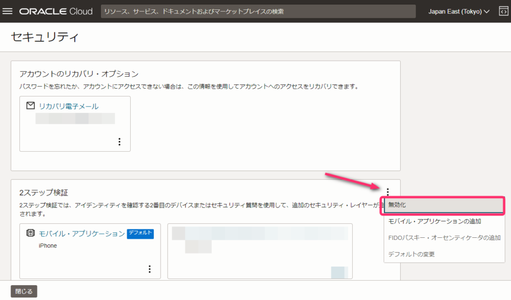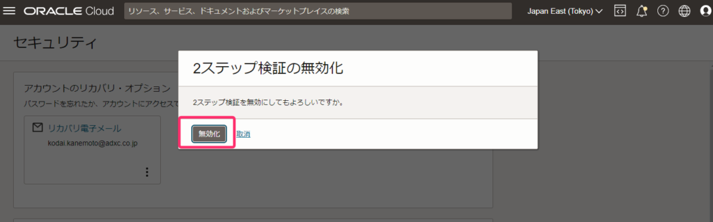 セキュリティ画面が開きますので、下図の縦に3つ点が並ぶメニューをクリックし、「無効化」より2ステップ検証を一旦無効化します。