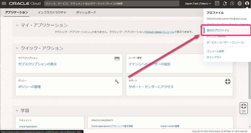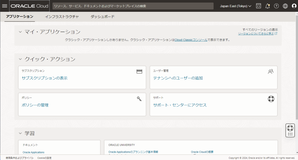 サインイン後にOCI(Oracle Cloud Infrastructure)ホームが表示されます。