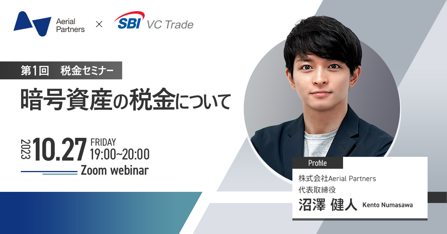 毎年「Gtax」の利用が急増する確定申告期に向け、暗号資産取引サービスを提供するSBI VCトレードと共同で個人向けの税金セミナーをオンラインで実施。10月を皮切りに、12月、1月と全3回に渡り無料で実施しますので、ご興味のある方はX(https://twitter.com/AerialPartners)で案内をご確認の上、是非ご参加ください💡(たまにプレゼントがあるかもしれません🎁)
