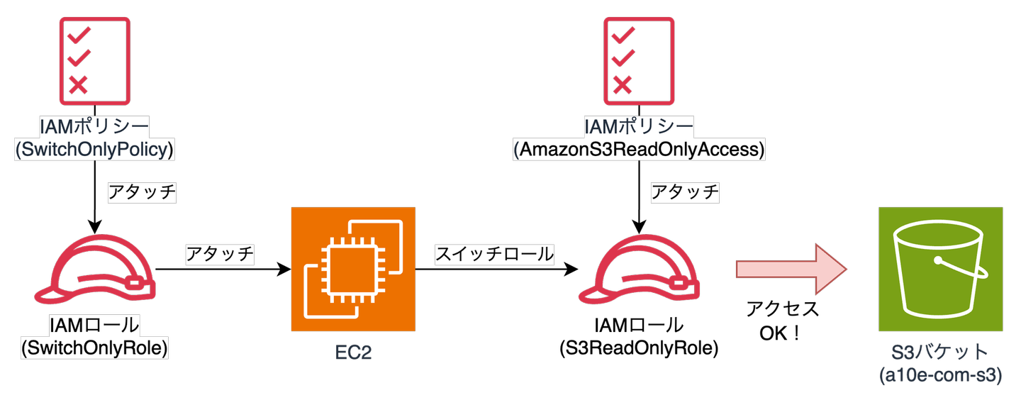 先ほどと違って、EC2インスタンスにアタッチするロール自体にS3バケットへのアクセス権限を持たせるのではなく、権限を持たせた別のロールにスイッチする(切り替える)ことで、EC2インスタンスに権限を付与します。