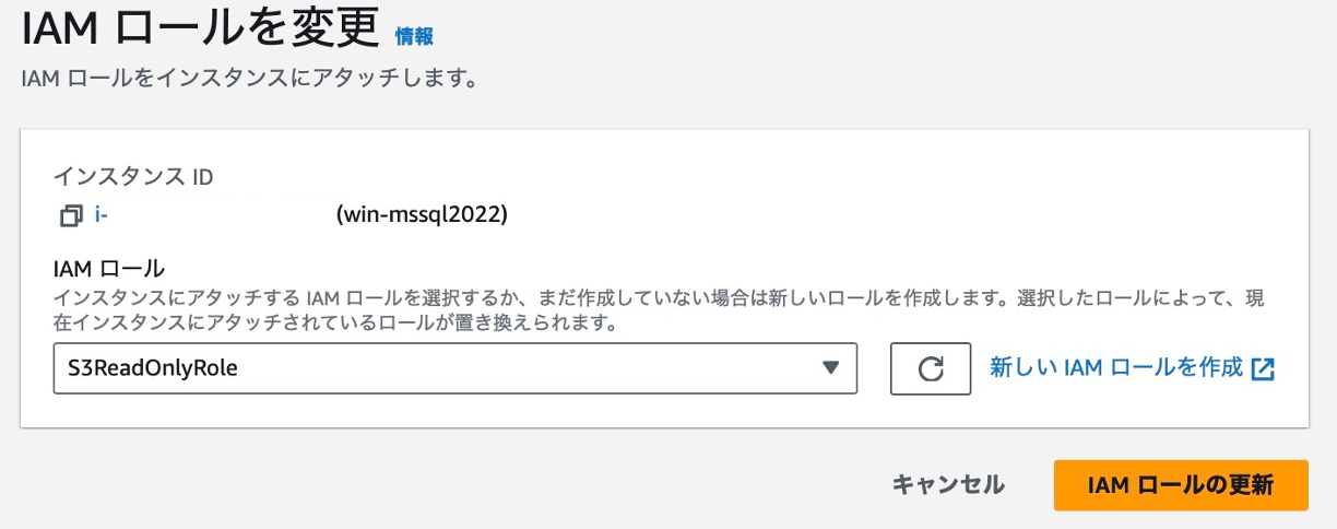 }先ほどと同じように、マネジメントコンソールかCLIからインスタンスにロールをアタッチしておきます。