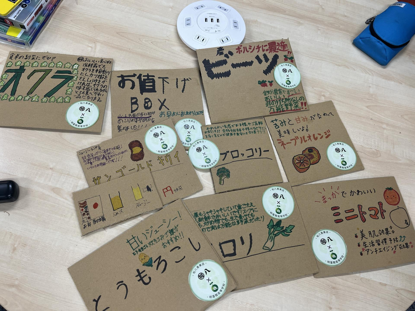 1日目は、実際に生徒の皆さんに店舗にきていただき、旬八がどんなお店なのかを案内しました。青果のプライスカード(段ボールPOP)を全て手書きしていると話したら、皆さんびっくりされてました!