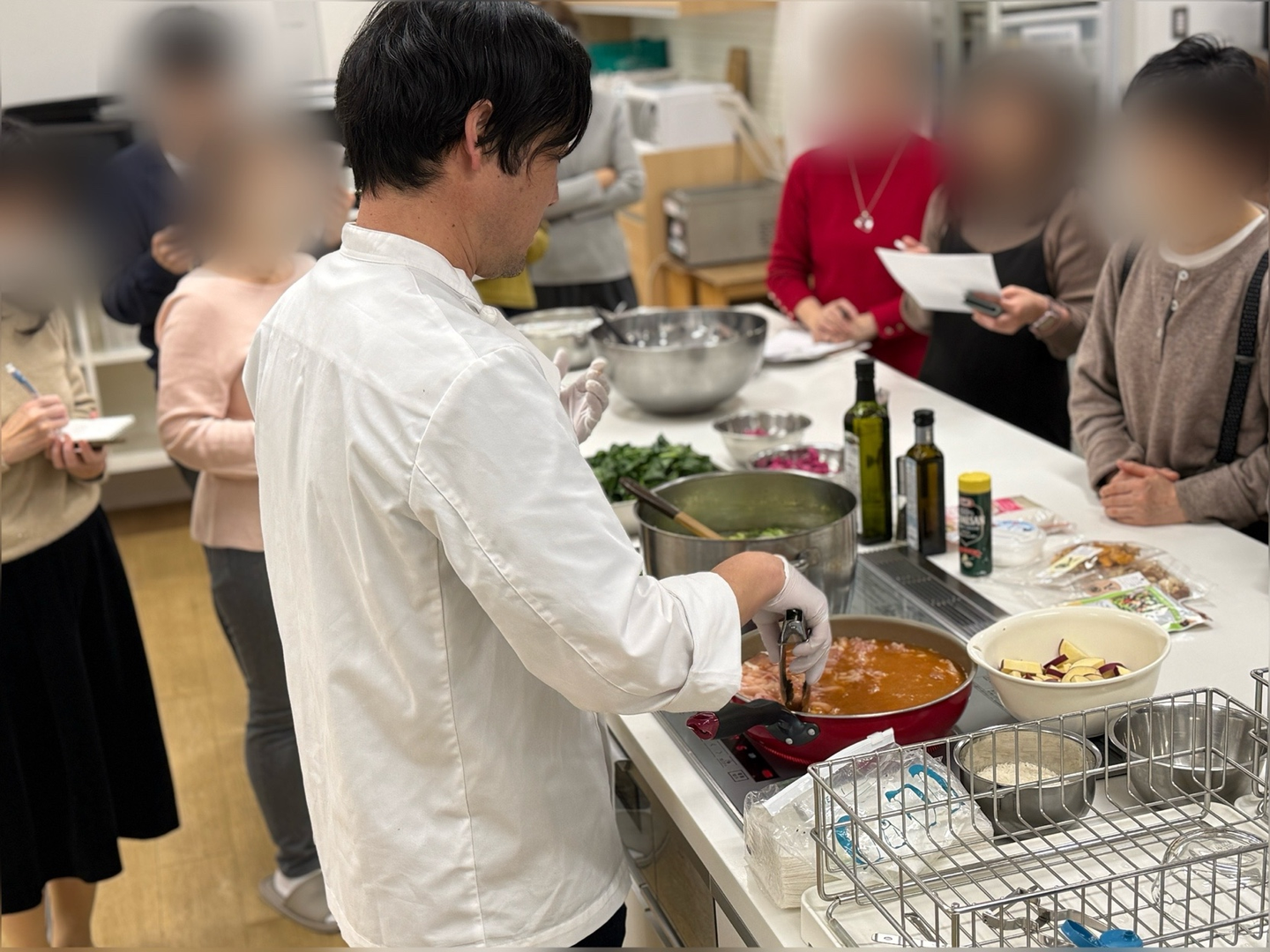 当日は16名の皆さまにご参加いただき、料理家でカルローズオフィシャルインストラクターのKEITAさんが、実演を交えながら冬にぴったりのメニューをご紹介くださいました。