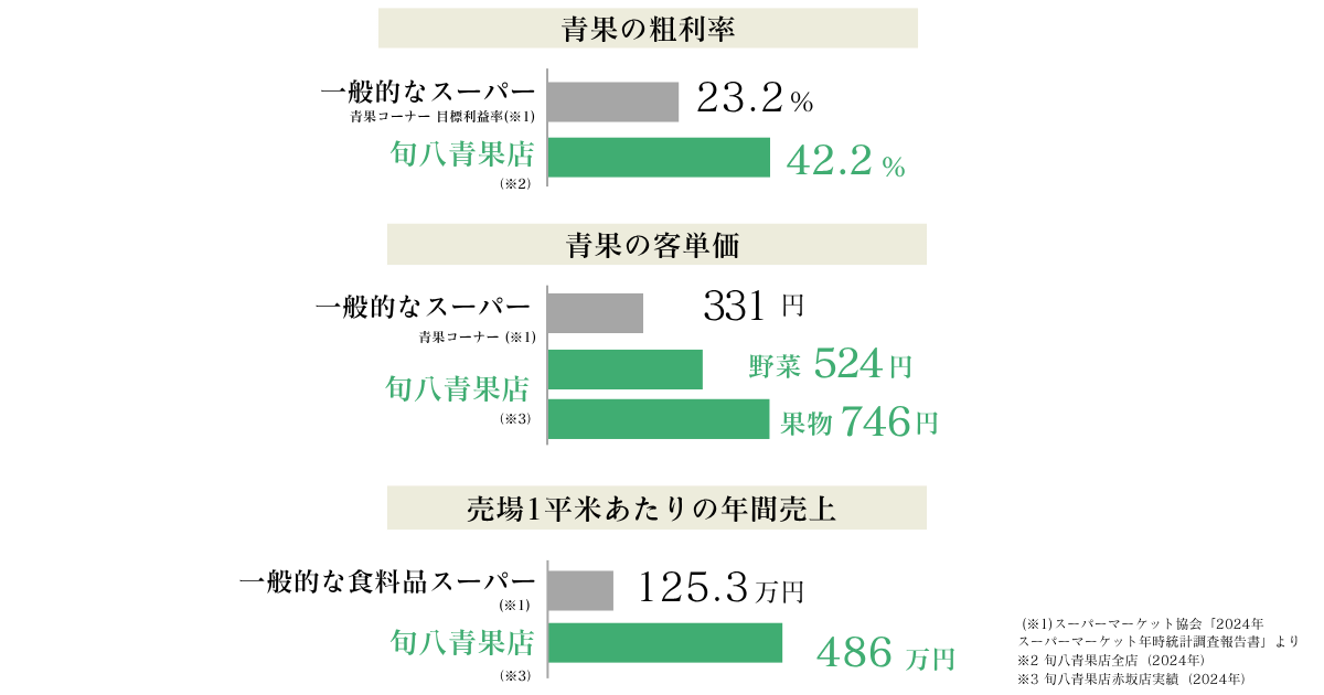 これは売上高に対してお店がどれだけ効率的に利益を出せているかを示すもの。優秀なSPA企業(例えばJINSやABC Mart、UNIQLO、成城石井)は10%を超えています。私たち旬八青果店の多くの店舗が10%台を突破(2025年5月時点実績)しており、コンビニなどの小売店と比べても高収益となっています。